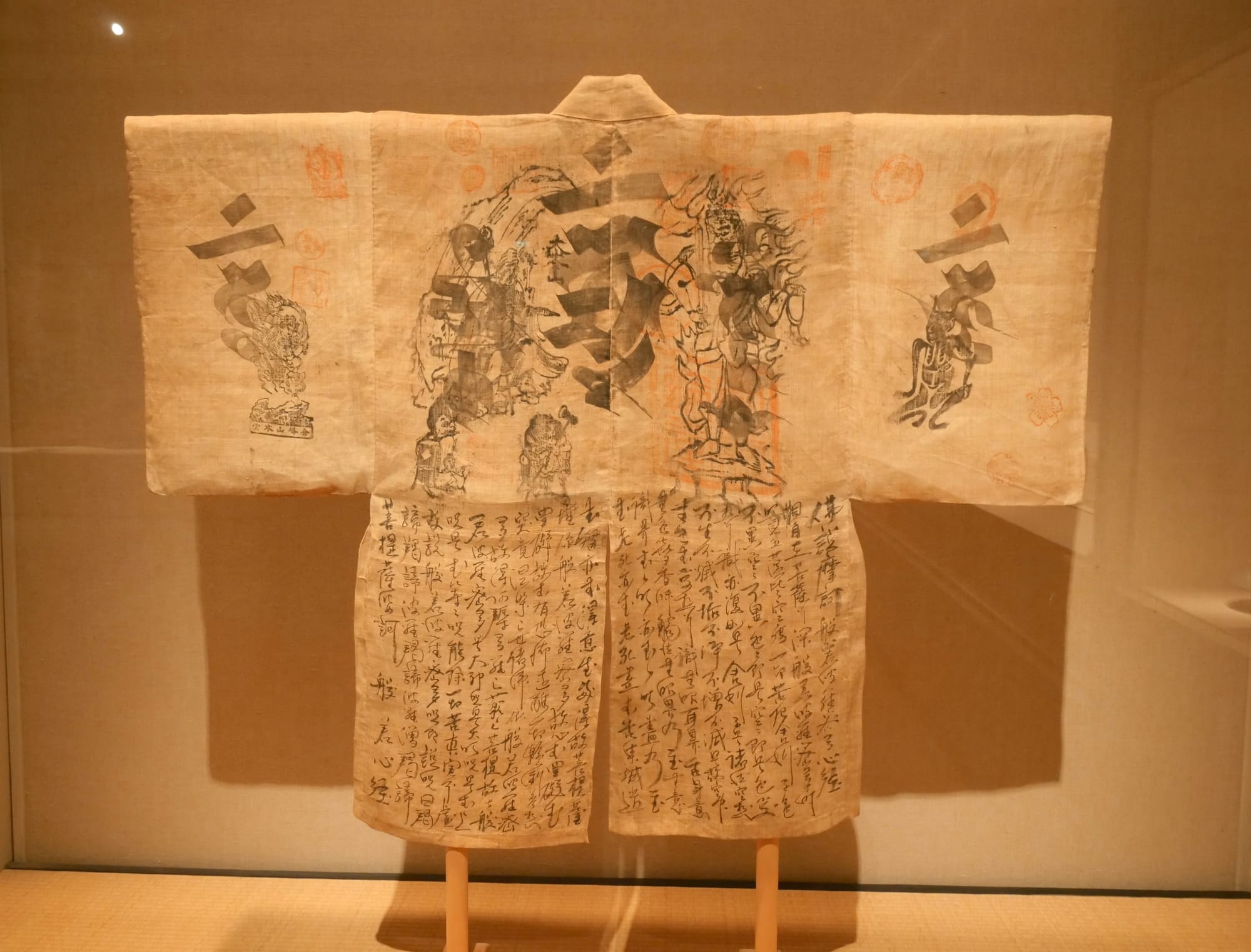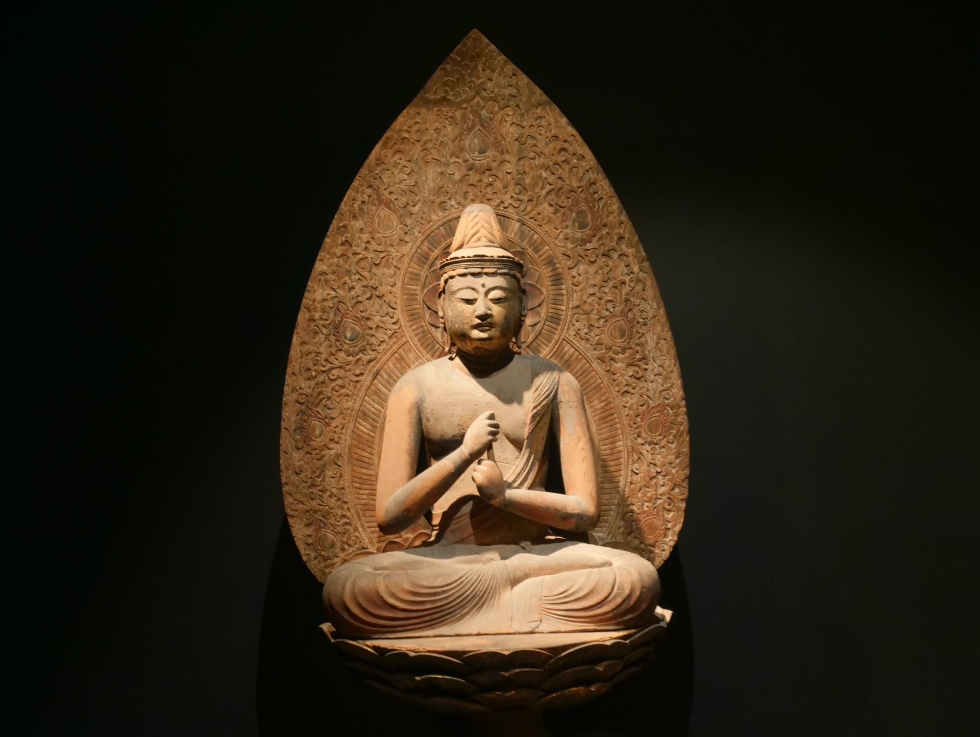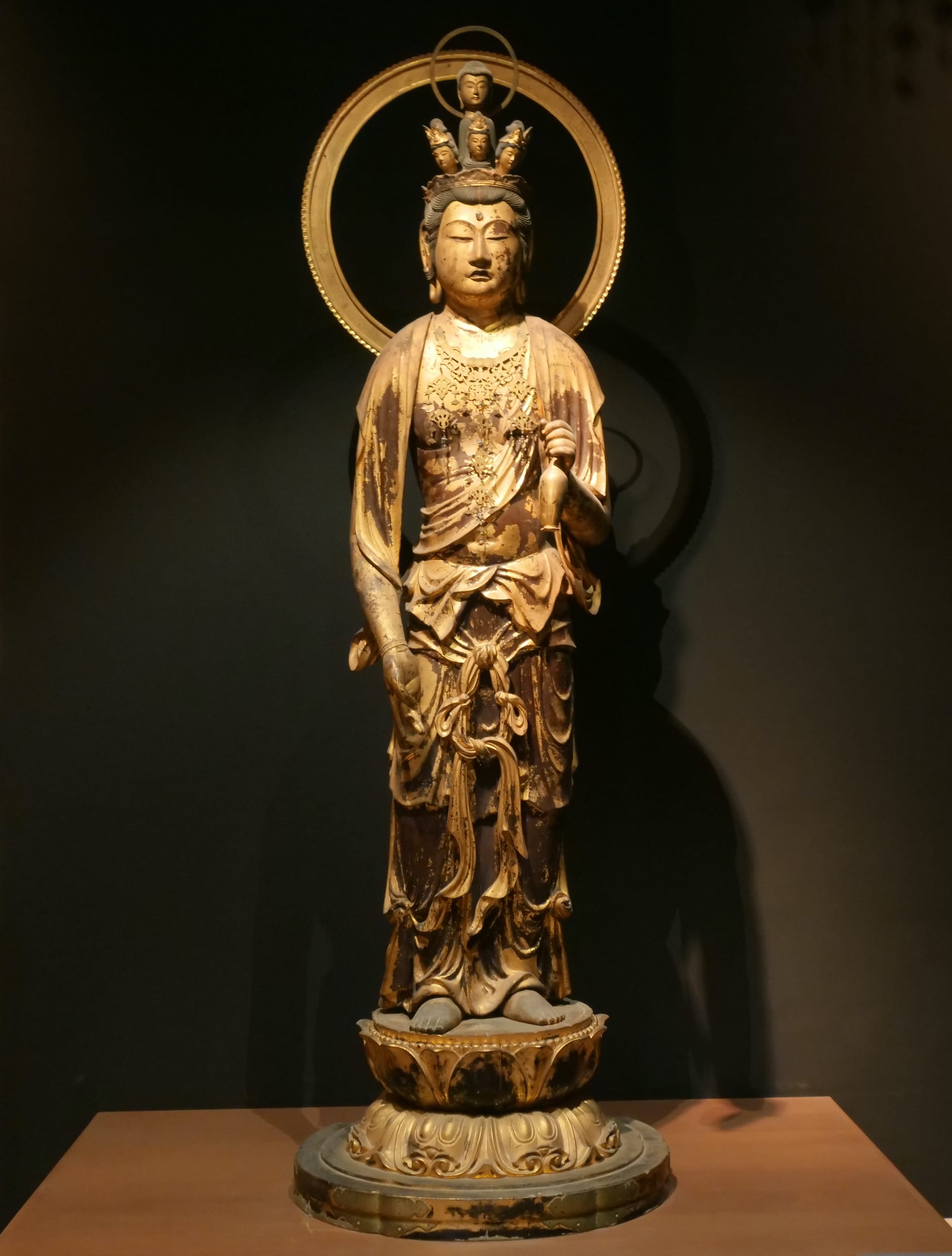 One of the most striking pieces is a wooden statue of Jūichimen Kannon, the Bodhisattva of Compassion with Eleven Heads. Standing six feet tall, decorated with gold leaf and metal, multiple small heads sit atop its own head, each representing a stage in enlightenment. The sculpture would have been an object of veneration in a small temple in northwest Kyoto. Its message seems clear — the path to awakening takes many lives, well beyond the one we are currently in.