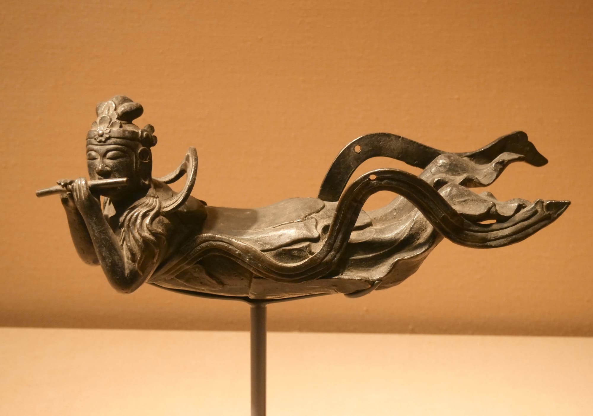 All that being said, I still appreciated the range of spiritual practices in the show. I was struck by “Fei Zhangfang at Gebei Pond,” a scroll from the 16th century painted by Sesson Shūkei. If the Pure Land art proffers celestial and demonic beings, this one gives us a very human, very Daoist figure. Fei Zhangfang was a disciple of a Daoist immortal who failed at his studies.