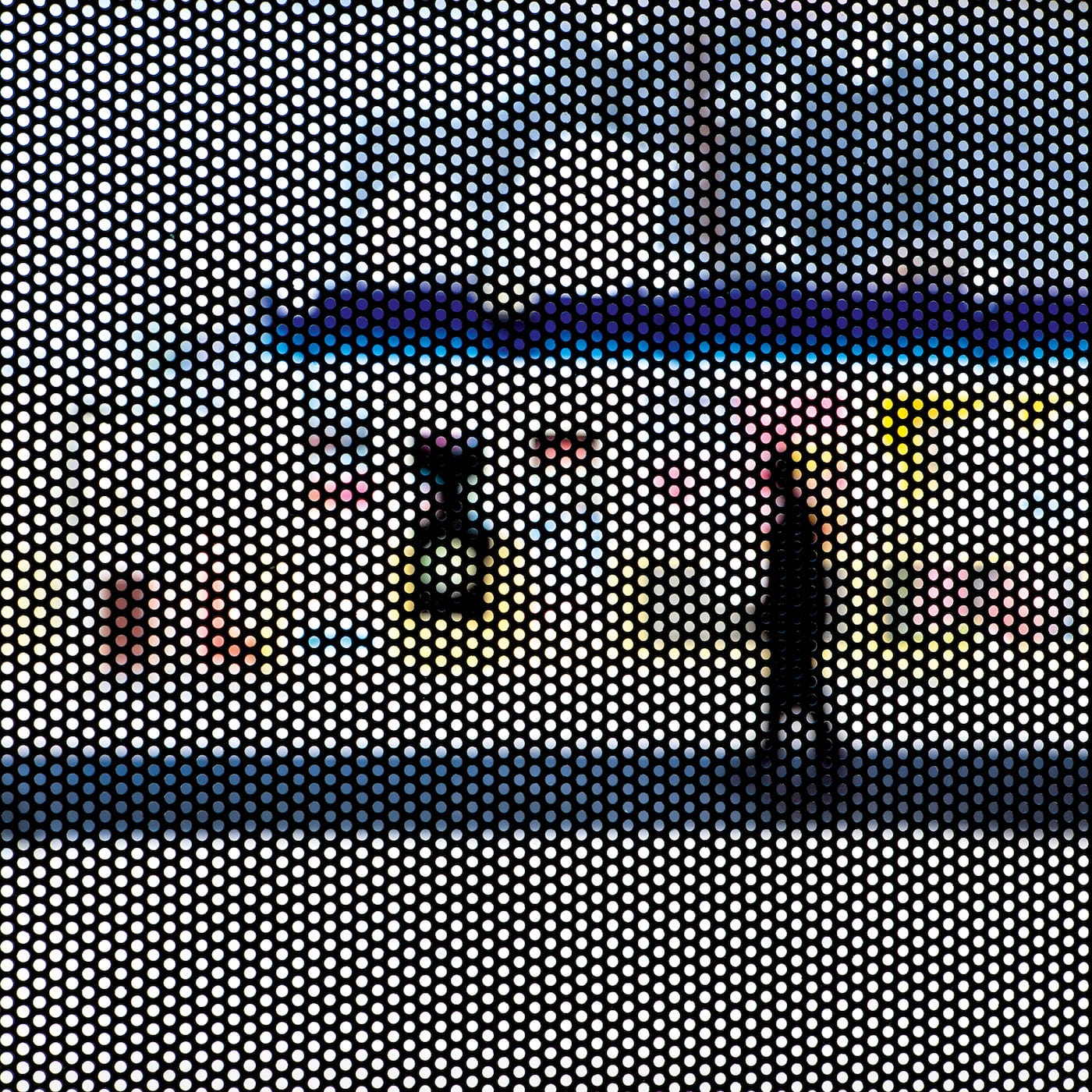 Anthony Hernandez’s Screened Pictures (2017–18) series may be familiar to those who have spent any amount of time at a Los Angeles bus stop. Street scenes are filtered through the black mesh walls surrounding bus benches in the city. The resulting images are diffused by Ben-Day dot–like circles: washed-out yellows and blues from a storefront or gas station, a luxury watch face from an ad with only the faintest outline of its branding, and a man slumped to his side with a bag of groceries. Beyond its grainy and impressionistic effect, the mesh filter also serves as a physical barrier, reinforcing how goods, spaces, and experiences may be accessible to some people and not others.