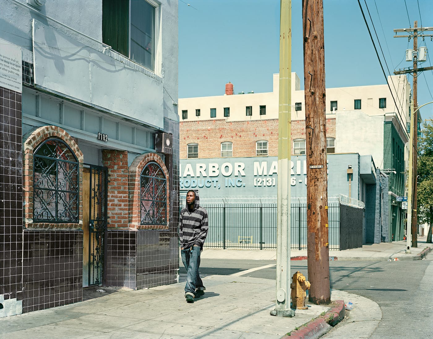 Lise Sarfati was interested in the “relationship of the character to the exterior world” in her Oh Man (2013) series, which focuses on pedestrians traversing a Downtown Los Angeles that is characterized by shuttered businesses, boarded windows, barbed wire fencing, and metal gates. In one image, a bearded man turns a corner as he’s surrounded by buildings with no doors or windows. A lone street sign casts a shadow against a brick wall with scuff marks and faded white paint. In other images, lone men walk through equally desolate parts of the city in broad daylight. These men, some of whom are of color or likely homeless, walk at their own leisure through environments that seem to rebuff and discourage their presence.