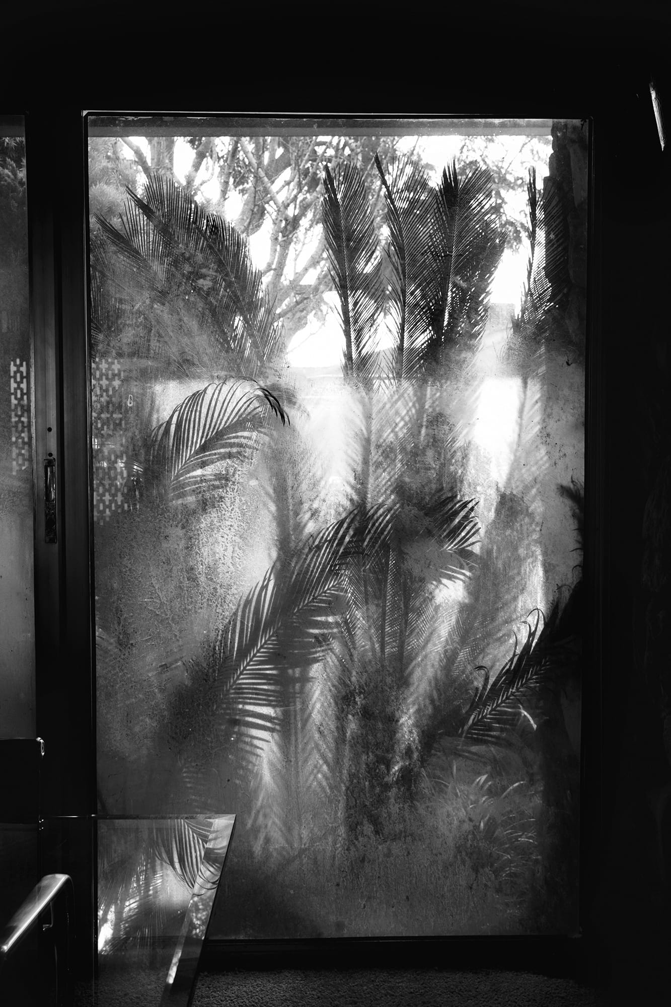 The shadowy palm fronds pressed against a glass door in “View Park, Number 1” (2016) remind me of a chance encounter with one of Paul R. Williams’s buildings, or at least what’s left of it. While taking a hike through Malibu’s Solstice Canyon a few years ago, I encountered the ruins of a ranch house, called Tropical Terrace, that was designed by Williams for a grocery store entrepreneur. All that remains after a fire in 1982 is the building’s foundation, surrounded by sycamore and oak trees. I was reminded of the fiction of Los Angeles as edenic paradise colliding against reality, fantasies set aflame by disasters both natural and man-made.