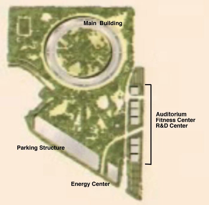 As part of the proposed development, Jobs says that Apple plans to build an office building that will house up to 13,000 employees and something that “architecture students will come here to see.” He added that parking will predominantly be underground, though there will be a parking structure on one side of the property. Other buildings will include an auditorium, fitness center, R&D center and energy station. The Apple energy center will generate energy through natural gas and other cleaner means, Jobs said during his presentation.