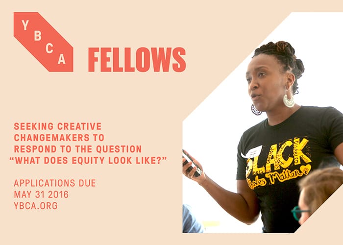 Interested in being a future YBCA Fellow? YBCA will select 30 individuals to join its next Fellowship cohort. Selected participants will respond to the question “What does EQUITY look like?” Application open April 16–May 31, 2016.