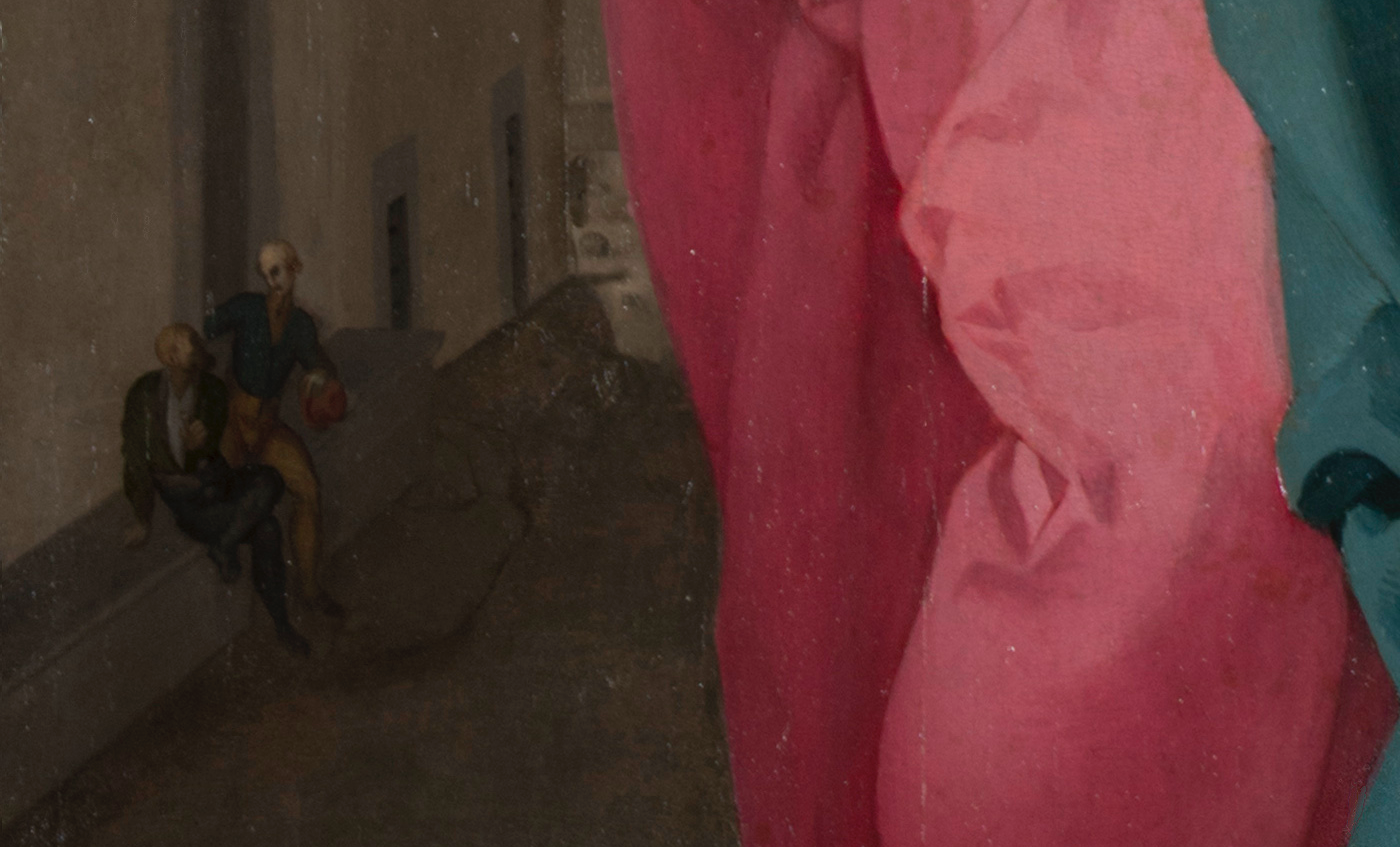 What I find most entrancing about “Visitation” — besides, of course, the Virgin’s gaze — are the minor characters that dot the painting’s sparsely decorated urban landscape. Toward the bottom-left of the panel are two tradesmen who were previously buried below an overpainted conservation attempt. They reemerge from their grey bench with similarly grey-painted faces. Looking like actors from a carnival masque, these men lean against a nearby wall in their stitched-up, bulging trousers. Scholars do dispute the identities of these tradesmen, however. The exhibition catalogue describes the nearby donkey as evidence that the two figures are actually Joseph and Zechariah. Speaking of the donkey, he is easily the most terrifying inclusion in the painting. Illustrated with an unnaturally human smile, the animal may be intended to bestow a beastly blessing upon Mary and Elizabeth’s meeting, but it just reads to my modern eyes as absurdly demonic. Why any three of these figures entered the composition is a mystery. After all, a study for “Visitation” also included in the exhibition demonstrates that they were not initially planned for the painting.
