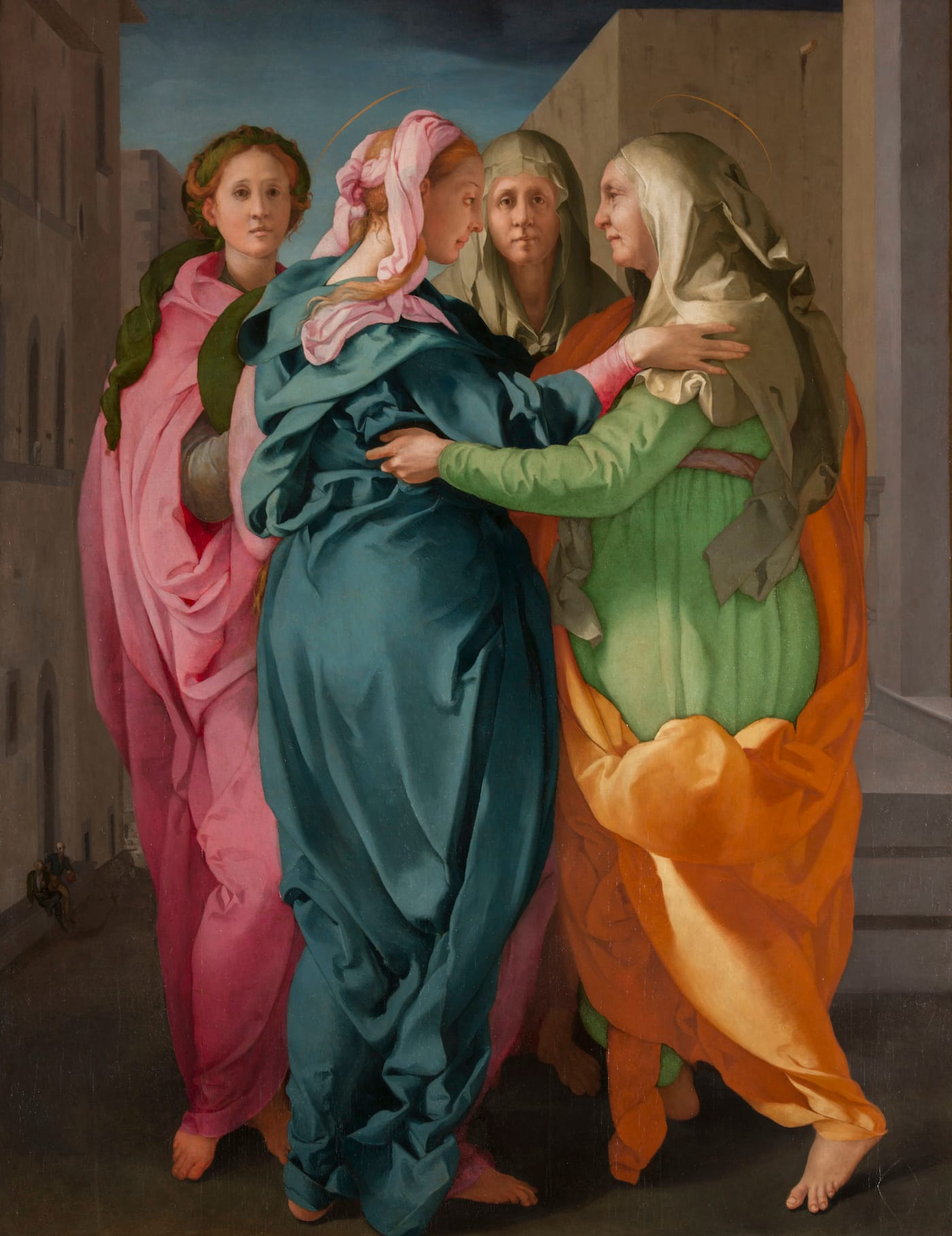 Like a tabloid magazine ripping its headlines from the Bible, Pontormo scandalizes the Virgin’s visitation with her aged relative Elizabeth. Attended by two other women, the cousins grip each others’ flowing robes. The elderly Elizabeth wears a chartreuse veil, which emphasizes her matronly disposition, along with an obnoxiously loud orange garment that ensnares her lime-green robe. The Virgin is considerably more stylish, if also barefoot. She wears a luxurious blue robe with a pink piece of fabric tied through her long, flowing hair.