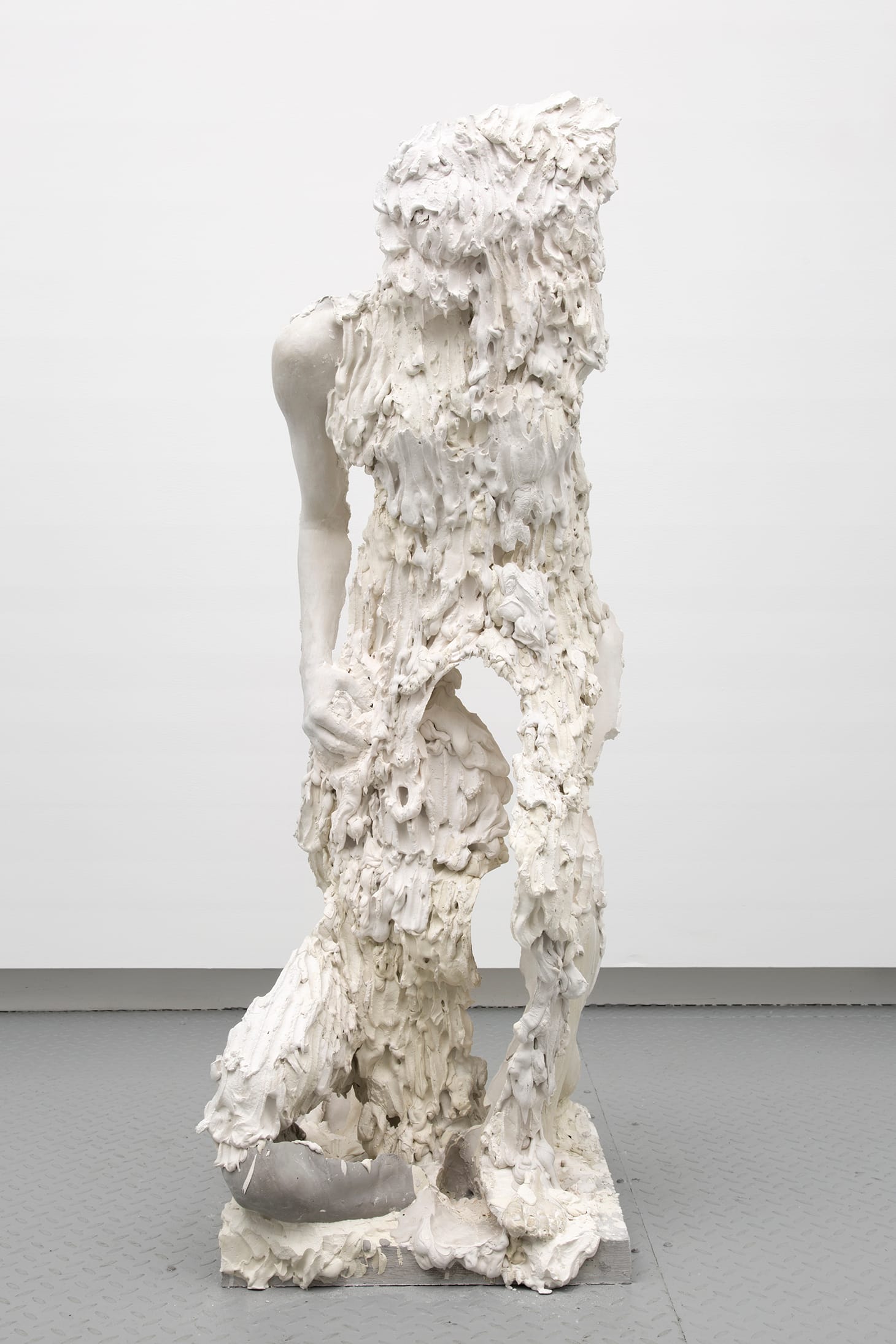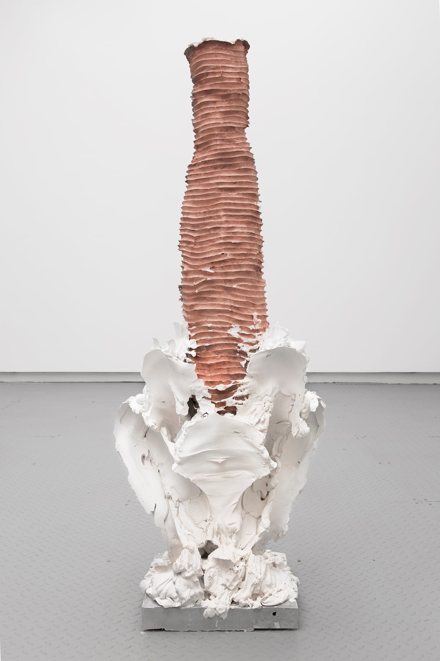 “Cinq a,” upright but lurching, is a counterpoint to “Urn 3,” as it offers a sense of being that is understandable only through one’s own touch. Plaster slathered here records this fleeting moment. Thickened and hardened white gypsum cement describes the simultaneity of sensation experienced from both sides of the skin, inside and out, where awareness arises from the accumulation of incremental fingerings.