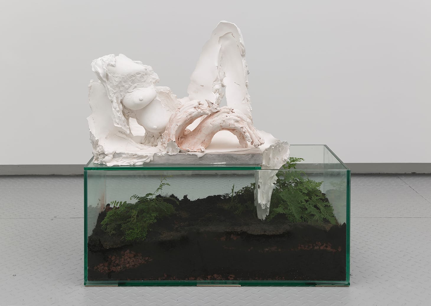 Cerqueira Leite poses a chance to feel the lifecycles of flora in “Urn 4.” Hanging over damp soil, the cast of a body is positioned to excrete what becomes nutrition for the small fern below. Dry plaster leaching water from its environment and then dripping into the terrarium offers this plant sensations of wetness all around. The promise of food that we might not perceive if dependent on sight, might have a different meaning when considered using botanical sensations.