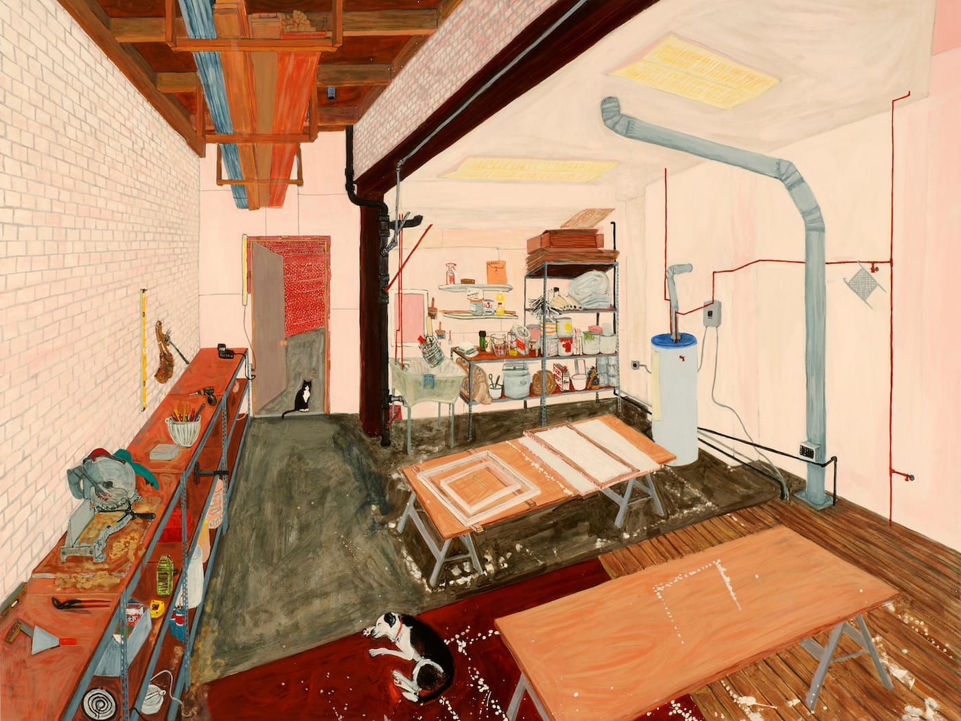 In her frequent images of her studio, which she does in acrylic on wood panels, McEneaney often includes streaks of paint on the floor, and this holds true for “Olive, Cole, Trixie,” as well as “Studio 2013,” (2013), and “Gesso Room” (2007). We might not notice these haphazard marks when they are on an actual floor, but on McEneaney’s wood panels, they become an integral, and at times dominant, element of the composition.