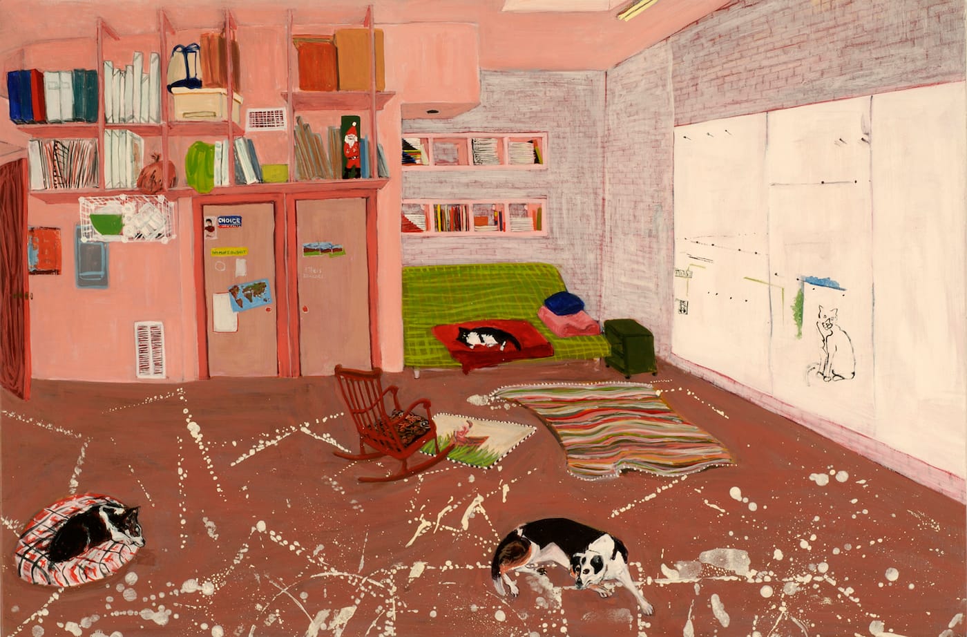 In “Olive, Cole, Trixie” (2007), the dog in the lower right seems to be gazing at the viewer, while the other two pets are sound asleep. There is nothing otherwise special about the room, except that it looks homey. There are no titles on the books on the shelves, as if they are binders and journals. A world map hangs askew on a closet door near a bumper sticker that reads “CHOICE,” with indecipherable marks indicating an unreadable slogan below. While there is much in McEneaney’s painting that seems clear and straightforward, it’s the mix of the mundane with the subtly ambiguous that draws the viewer in.