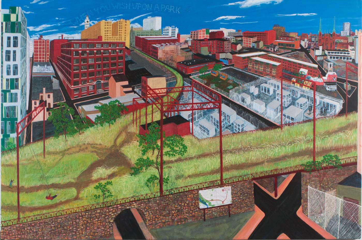 In “Studio 2013,” the paintings seemingly in progress include pastoral landscapes and domestic interiors, along with a larger work focusing on The Rail Park, one of McEneaney’s significant civic interests. McEneaney is the President of the Board of Directors for this ambitious project, which aims to convert the disused Reading Railroad viaduct, which runs from Northern Liberties to Brewerytown in Philadelphia, into a park. That painting, “When You Wish” (2015), also on view at Locks, offers a vision of that park, a birds-eye view with two tiny children swinging from the overhead steal beams of the rail line. If the children at play impart an air of makeshift fun, the empty streets beyond the greenery of the park have an end-time feel, and these are the only children who remain.