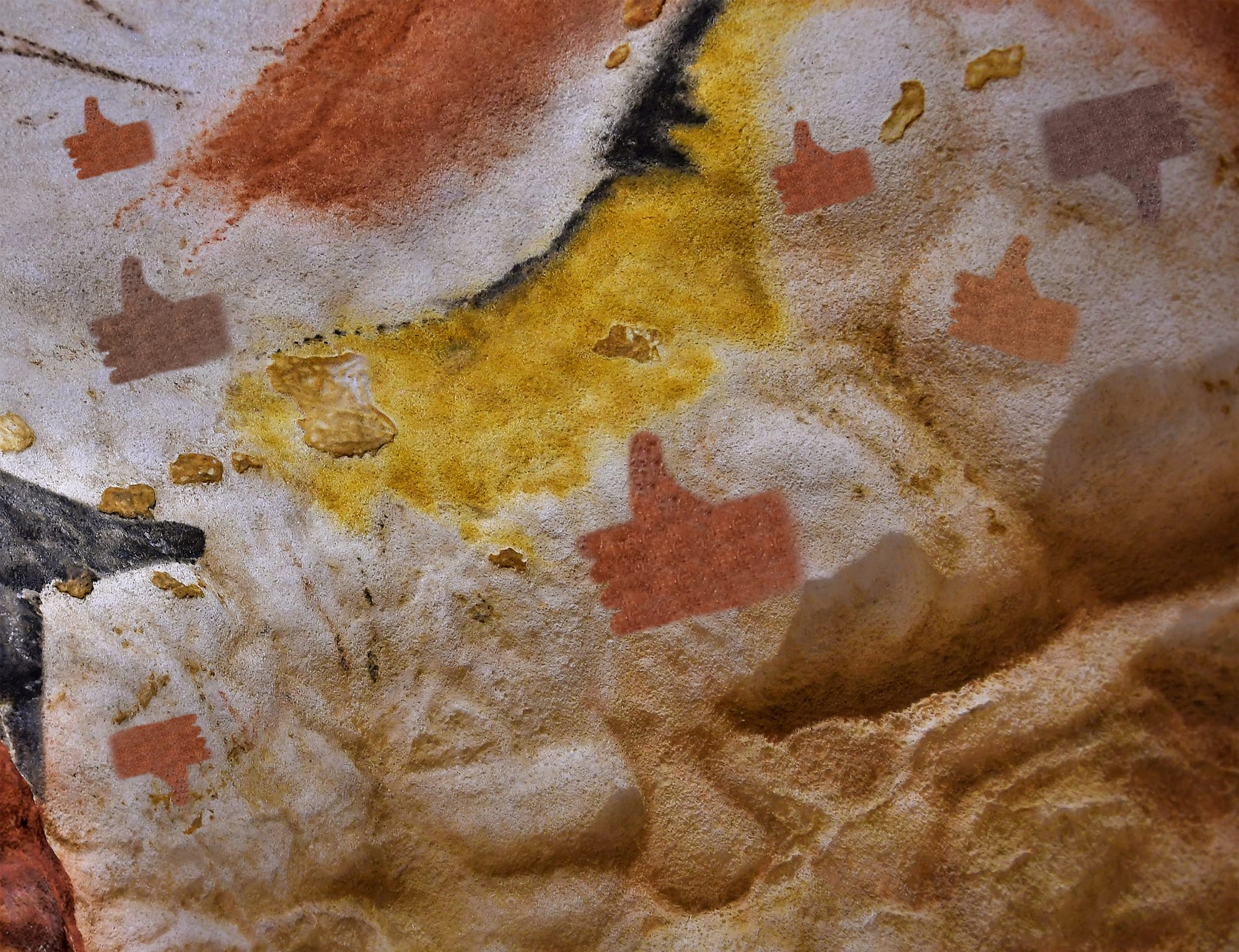Overshadowed for decades due to its placement near a particularly gruesome depiction of an epic battle with a bison, the wall of five rudimentary thumbs-up gestures (and two thumbs down) puts the “like” symbol at the heart of the Upper Paleolithic period, predating the advent of social media by approximately 17,000 years.