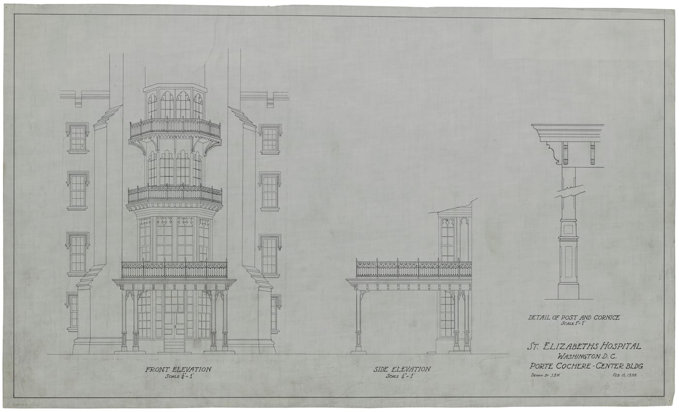 Architecture of an Asylum: St. Elizabeths, 1852–2017 at the National Building Museum in Washington, DC, is an in-depth exploration of design in the context of mental health, concentrating on the local St. Elizabeths. Architectural drawings from the Library of Congress are joined by objects used in treatment, patient art, design elements from the St. Elizabeths Center Building that’s under renovation, photographs, documents, and other materials. Opened in 1855 as the Government Hospital for the Insane, the Center Building was designed in accordance with the Kirkbride Plain by architect Thomas Ustick Walter.