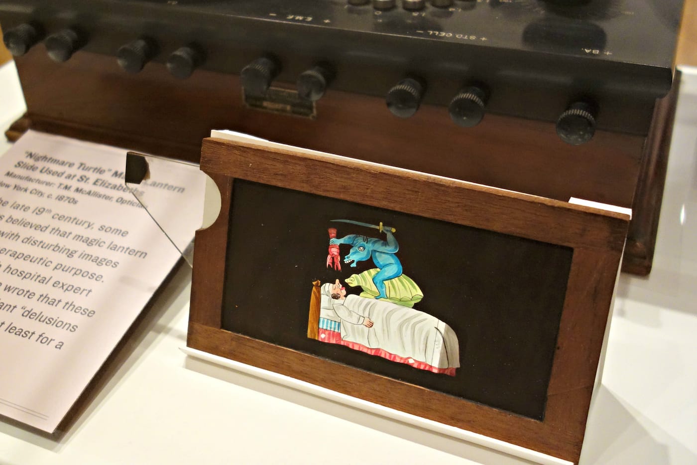 That separation is reinforced by the institution’s sprawling vista of the city below, combined with its rural landscape, formed by 1,000 carefully planted trees. The institution also used to operate as its own self-sustaining community through the keeping of livestock, farming, and power and water stations. The solitude is part of the therapy encouraged by its bucolic design. The exhibition acts as bridge across that isolation, using objects like wrought-iron architectural details — including foliage-adorned window guards — to demonstrate how the beauty of the St. Elizabeths Center Building has also been a form of confinement. An early electric shock machine and a diagnosis chart that lists “homosexual tendencies” and “abortions” as symptoms are reminders of how physical treatment has often lagged behind progressiveness.