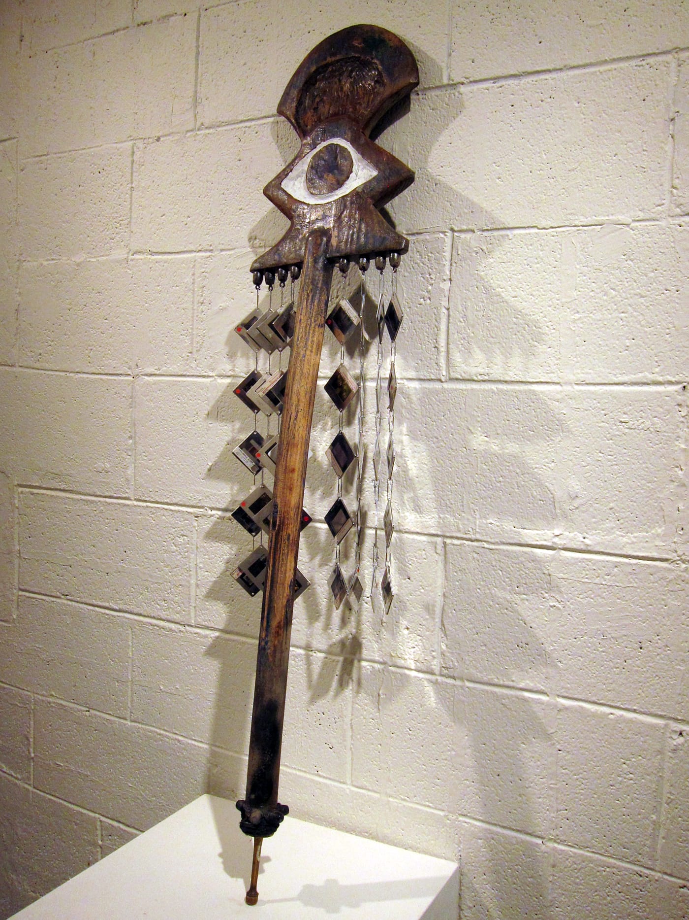 Nearby, in Williams’s sculpture, slides are shown as lightweight ornaments dangling from a wooden staff he carved and playfully titled “Curatorial Staff.” Resembling the powerful rod of some fictitious chief, the piece alludes, somewhat simplistically, to the power curators yield over the spaces recorded in these slides. Even if they serve mostly as decoration here, I found myself attempting to view their colored windows and make out scenes in the shadows. Useless as they may be in the 21st century, there’s something undeniably wondrous about these tiny records, many of which are annotated. Each, in the end, represents someone’s efforts to manually document the encyclopedic art museum. To display them is to honor those past, quiet labors.