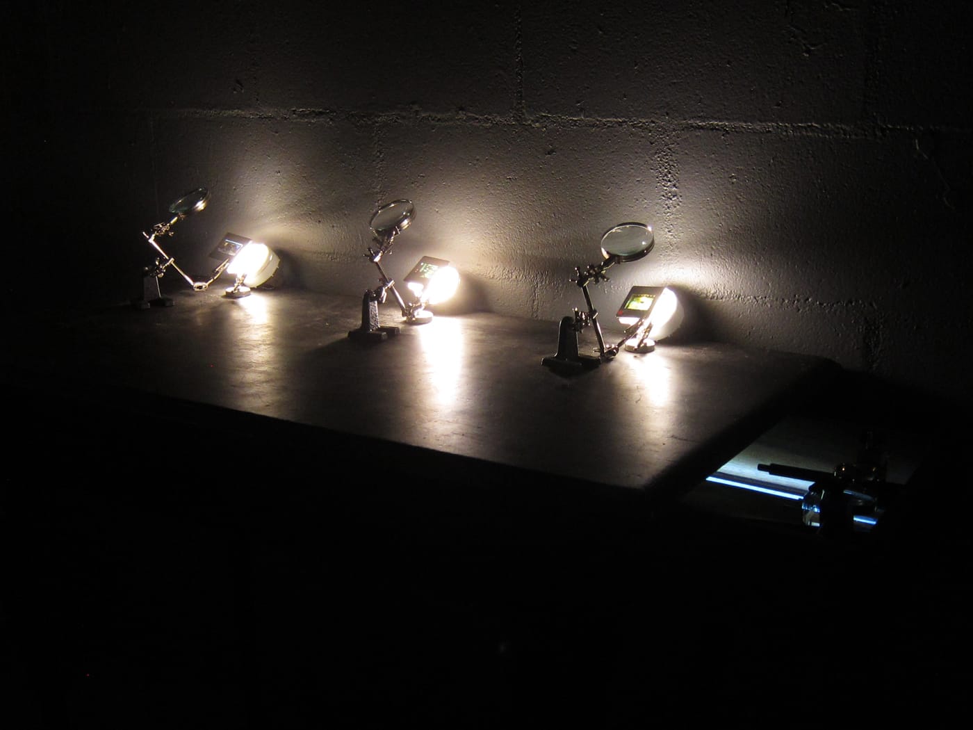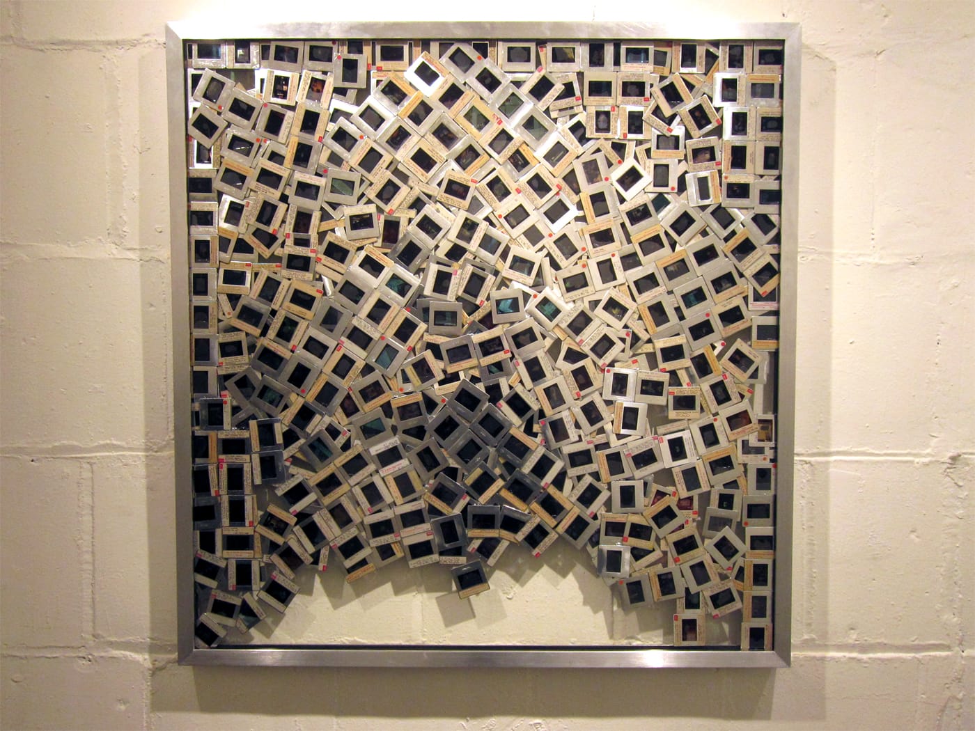 Other artists, like Dustin Yellin and Michael Kelly Williams, paid more attention to the vintage, metallic casings of the slides. Yellin’s “Attn Viewer: Please bury for 2000 years” recalls his Ant Farms series, filling a metal frame with over 500 slides, arranged as if held up at its base by an invisible mound. Placed to form many layers, the images of the slides are nearly impossible to make out; they form an incredibly dense mass of metal and celluloid, representing the obsolete contents of our era trapped in a hardy time capsule.