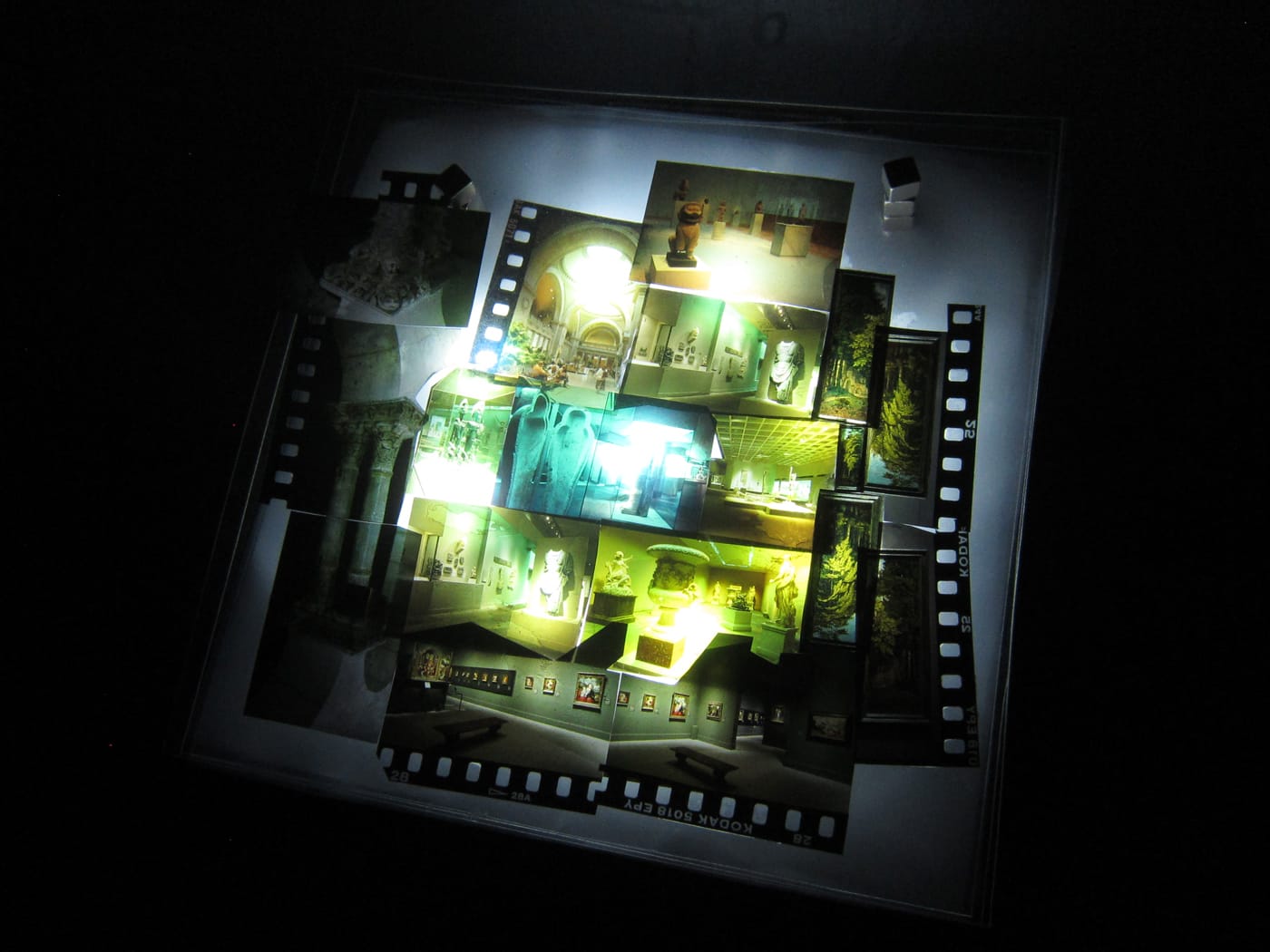 Through careful handiwork, artist Martina Mrongovius also formed new connections from these artifacts by creating nine collages of slides, each backlit by light boxes and set under microscopes. Some simply layer copies of the same image, but are shifted slightly, so galleries appear as unfocused spaces or artworks appear mirrored. Other slides are brought together to form wider views of the Met’s architecture, only they’re fragmented, hovering between reality and fiction. Mrongovius’s installation, which forces you to closely scrutinize the slides, like specimens, highlights their objectness. The tiny image requires a type of viewing we don’t often employ today, as a picture that’s static, unzoomable, and unswipeable.