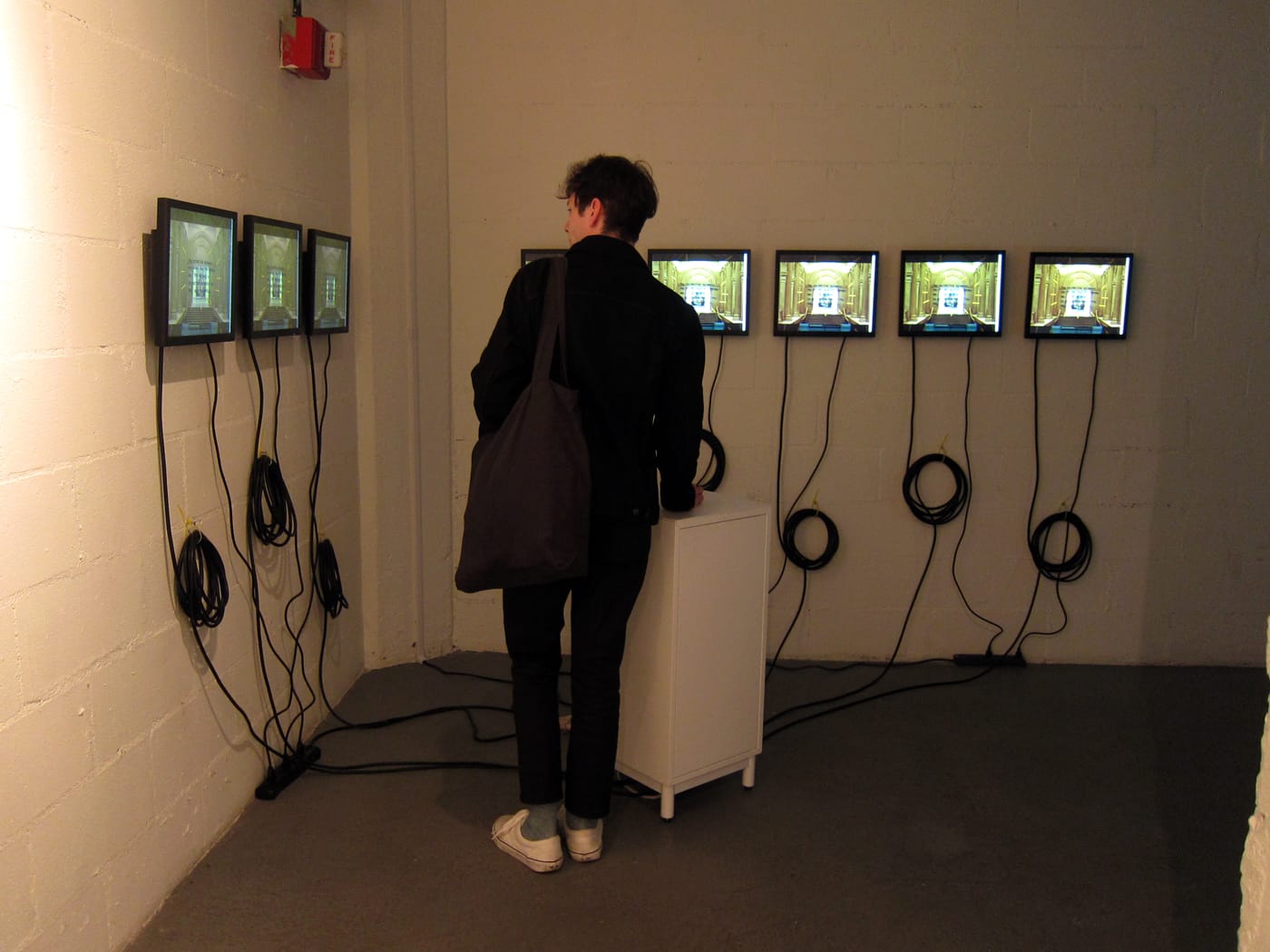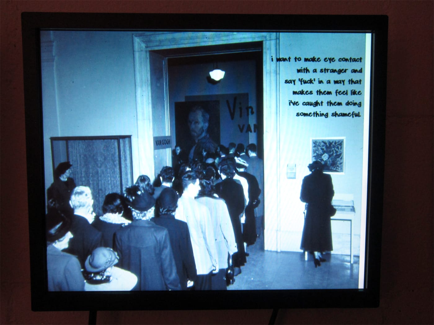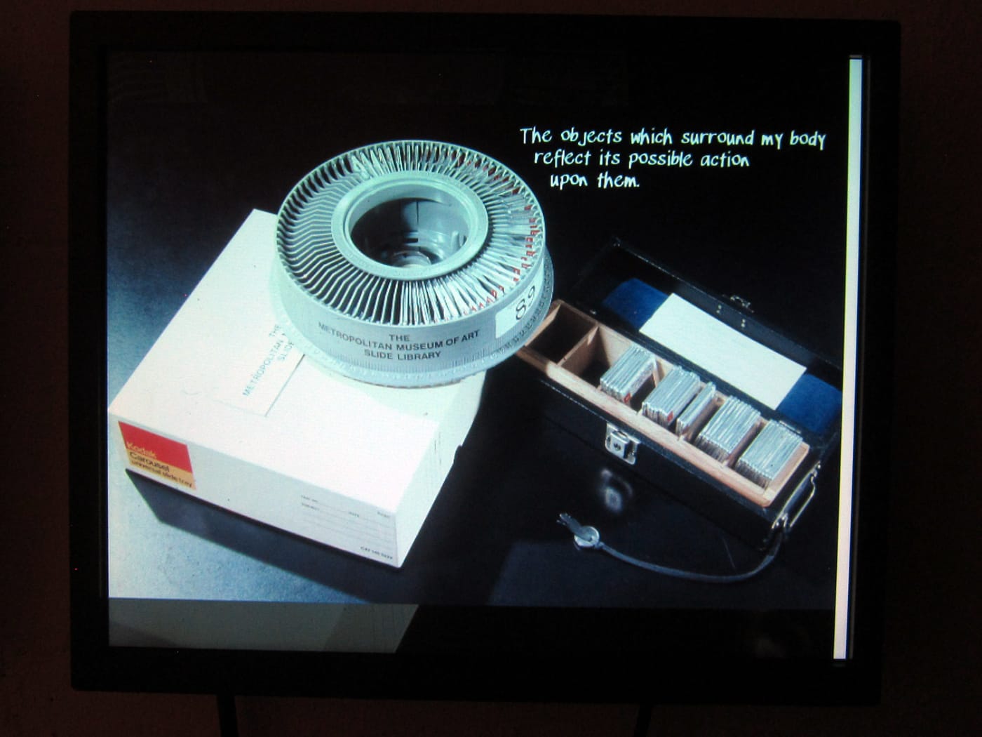 Embracing our ways of digital consumption is Andrea Wolf, who has created a slideshow of slides that plays on eight monitors, rather than on a manual carousel. Viewers control its speed by pressing a button, which pulls up a random slide from Wolf’s chosen 74. Each also features a quote she’s scribbled over a portion of the picture, drawn from texts of critical theory such as Hal Foster’s Bad New Days or Susan Sontag’s Regarding the Pain of Others. Also inspired by her own memories of the Met, Wolf’s image bank suggests new narratives, contemplating how an institution interprets its archives and consequently produces knowledge through its methods of documentation and organization.