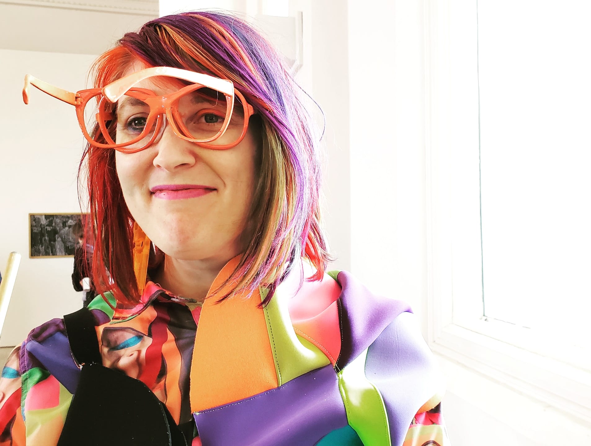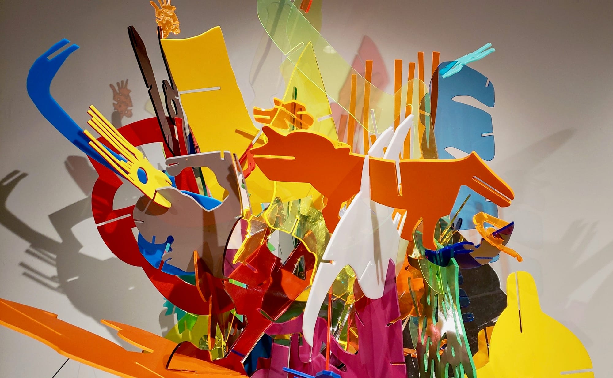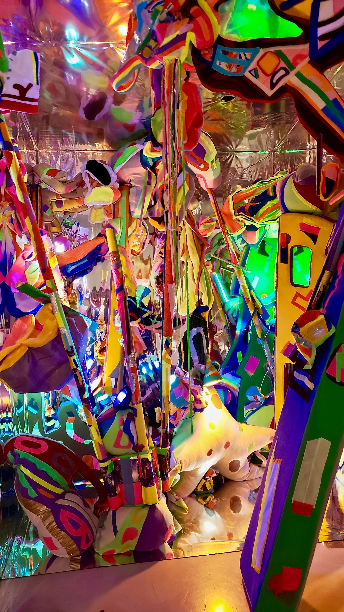 “All of the pieces I make have a performative component,” said Whittle, during an artist talk at The Carnegie Art Gallery in nearby Covington, Kentucky. Whittle is highly recognizable, prone as she is to wearing homemade fashion adorned with colorful iterations of her shapes in felt or foam. Standouts among Whittle’s work on display at CAC include an installation of riotous color and shape, amplified by reflective mylar surfaces in a small chamber off her main gallery space, and a row of cut acrylic puzzle-sculptures, which configure her language of shapes into bristling, dimensional katamari-like standing structures. Video montages chronicle Whittle’s daily fashion challenges, including experiments with paper garments, and hook-and-loop works that physically connect people with a special hook and loop tape that NASA developed to anchor people to surfaces and each other in zero-gravity.