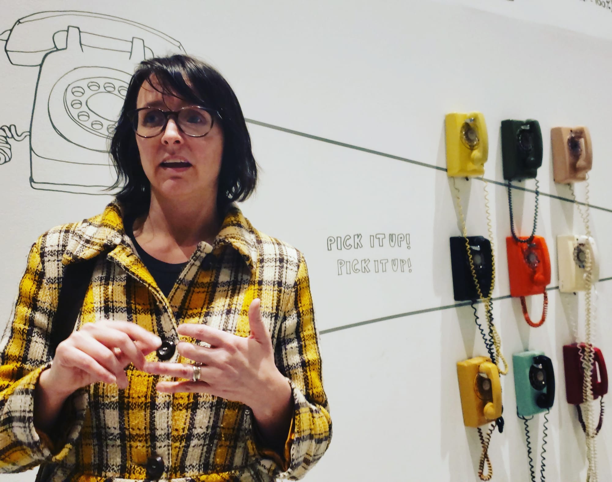 “Let it ring! The machine will get it,” directs a prompt written on the table next to the answering machine, in contrast to the exhortation “Pick it up! Pick it up!” written on the wall next to a grid of old-fashioned rotary dial telephones that are a dimensional part of a giant, wall-sized mind map visualizing Cullen’s process and projects in cartoony drawings and handwriting.