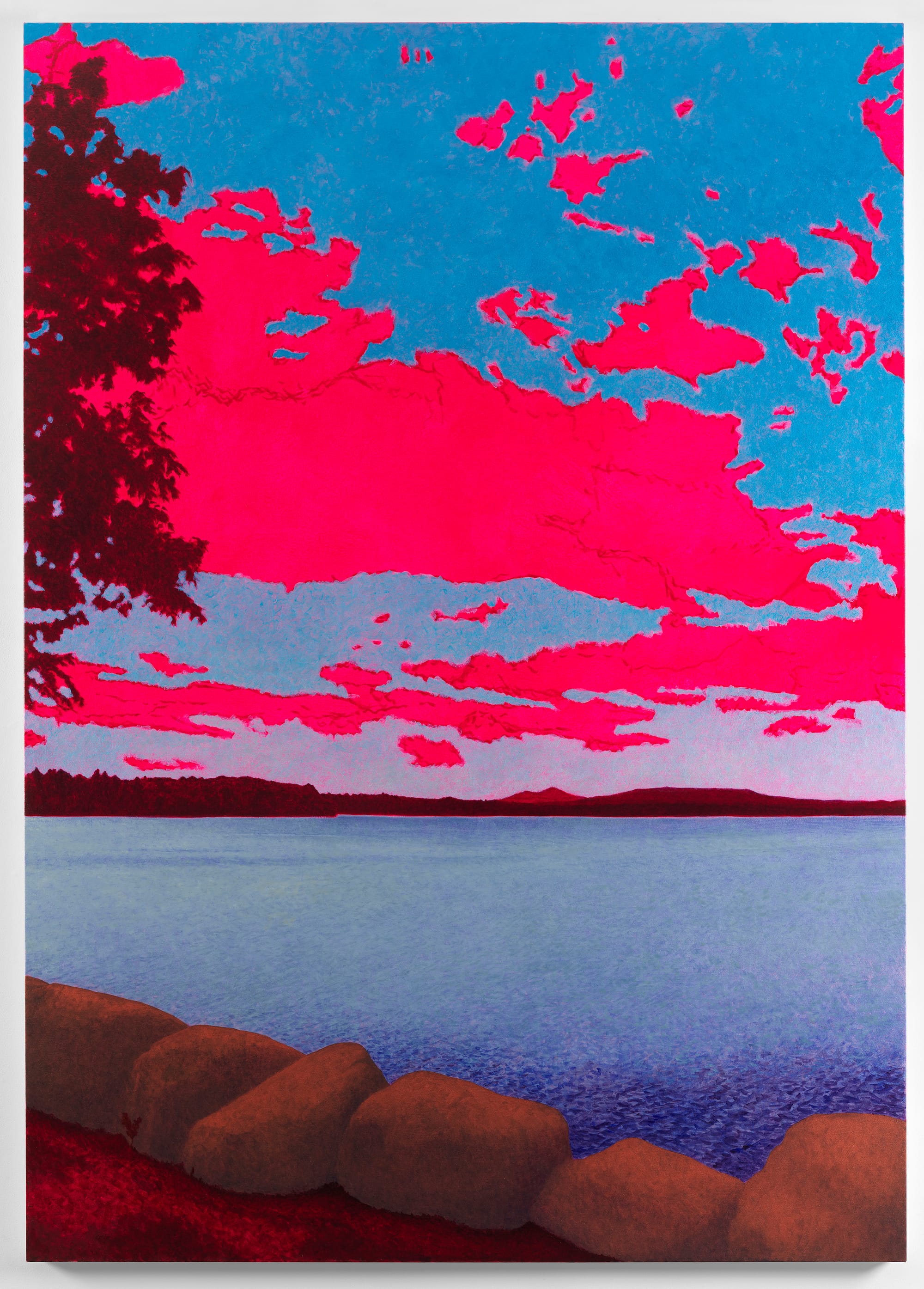 The titular landscape painting — Niles's first since his college years — is rendered in his signature electric palette. Searing magentas and rich blues fill the canvas. Drawing on numerous influences — Dutch baroque painting, Color Field painting, ancient Egyptian sculpture, Caravaggio's use of chiaroscuro, to name a few — Niles has created a style all his own. His works portray almost exclusively men, women, and children of color, rendering their skin in glimmering, contrasting tones of gold and brown. With elegant brush strokes, Niles articulates flesh subtly, painting layer by thin layer. Skin tones take on a gem-like quality while clear varnish saturates canvases with a glossy finish. Quiet moments of reflection are rendered with glitter and bright, flashy colors, lending a striking, fantastical quality to each figure. Niles prompts the viewer to reflect on significant questions of love, loss and failure, and the innately human emotions we all experience.