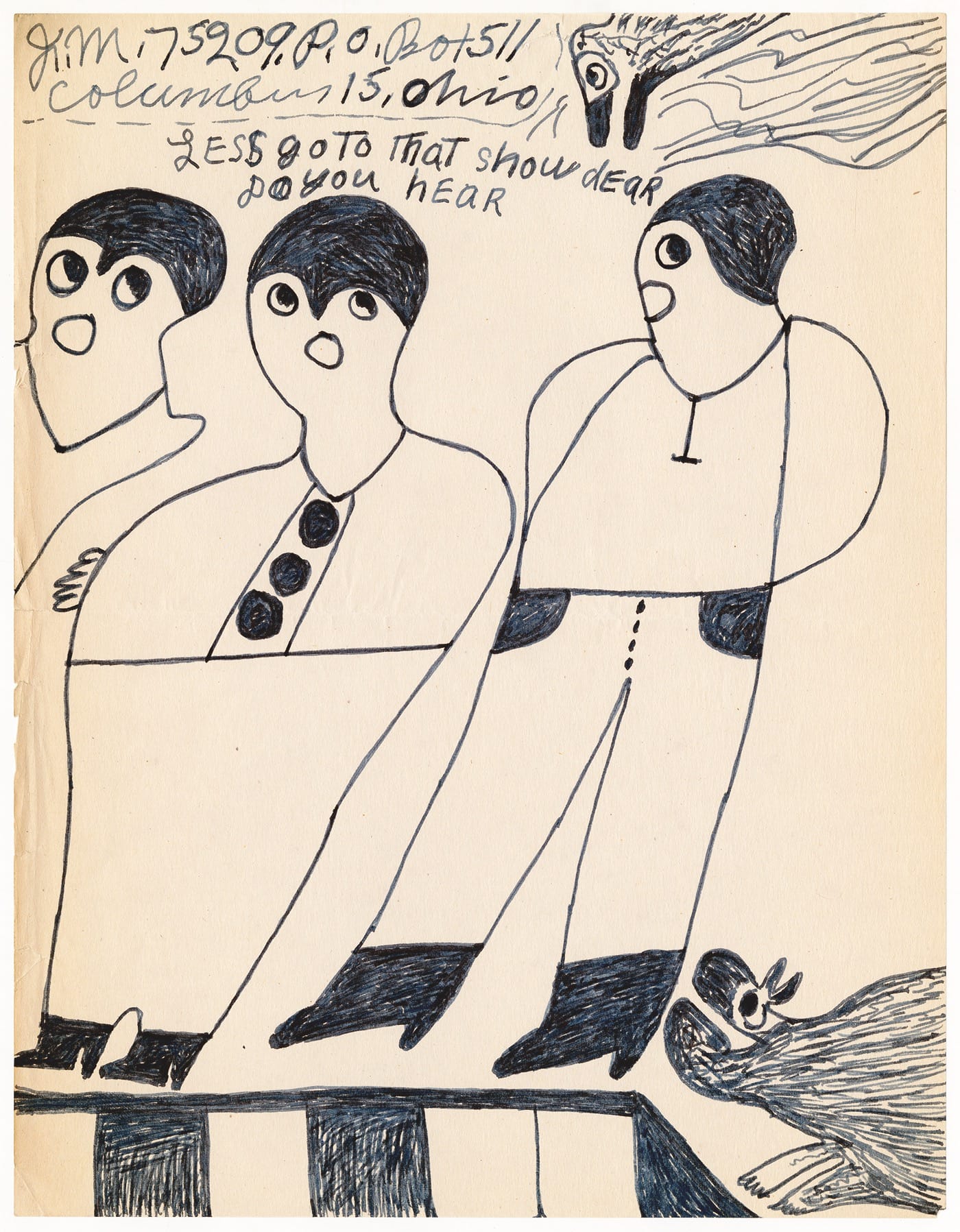 The Next Big Thing, which may well be the Real Thing, too, could be a recently surfaced cache of ink-on-paper drawings made by Joe Massey, a self-taught African American artist who spent the latter part of his life in jail. His unusual, vivacious creations are now being shown, through October 19, in Shut Up: Joe Massey’s Messages from Prison, at Ricco/Maresca Gallery.