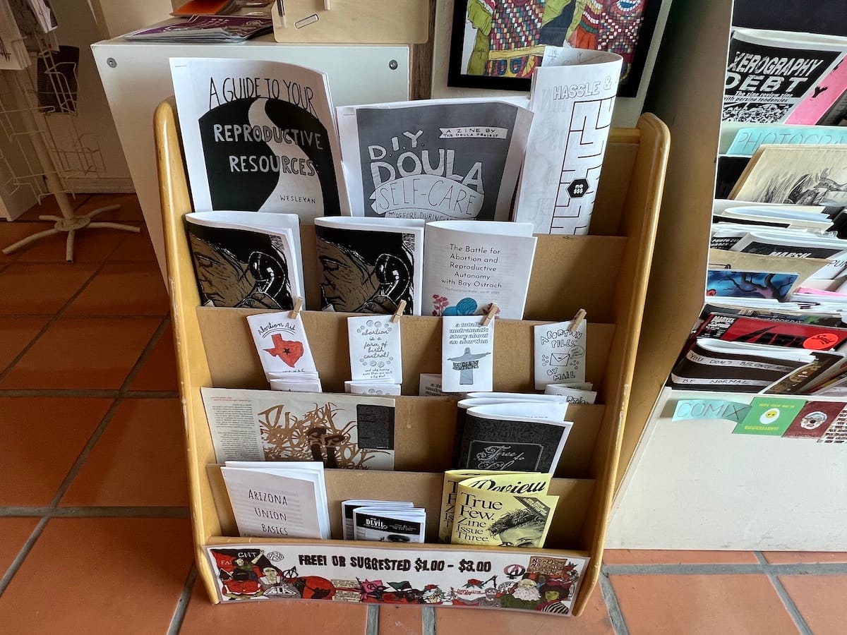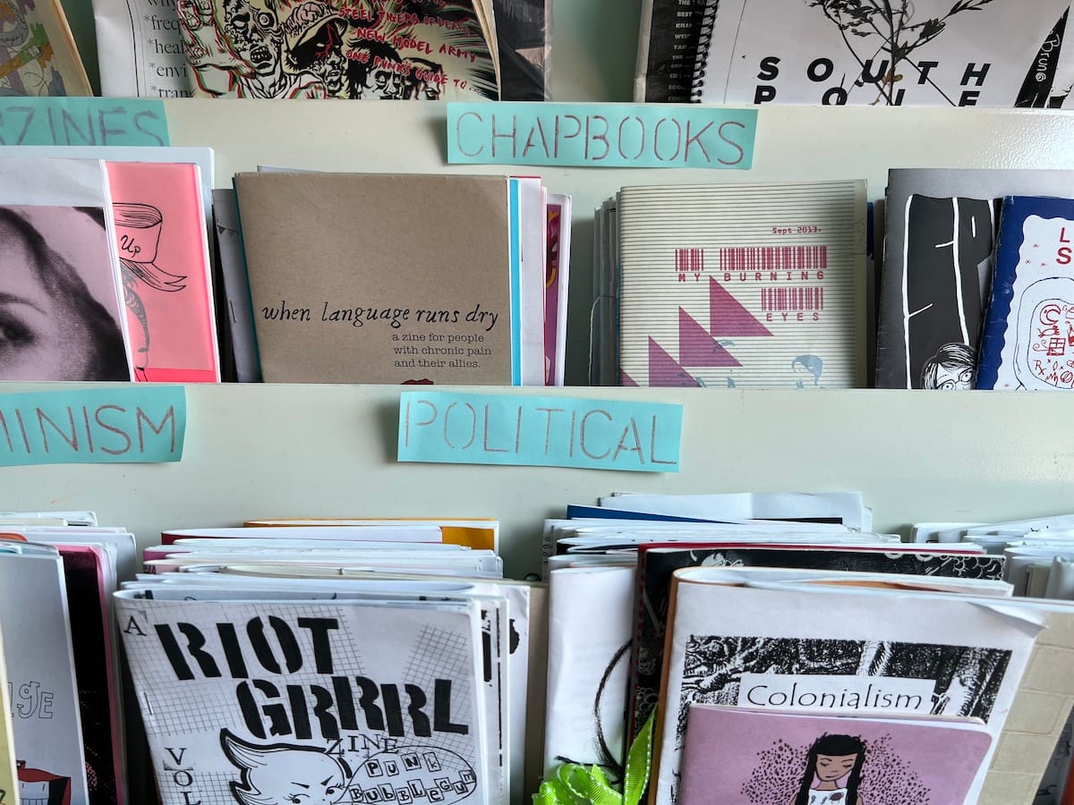 The store also houses a zine library, where people can explore more than 1000 works created from the 1980s on. They’re organized according to categories that include art, feminism, political, queer, and more. On one rack, they’ve got free zines on topics such as abortion and unions.