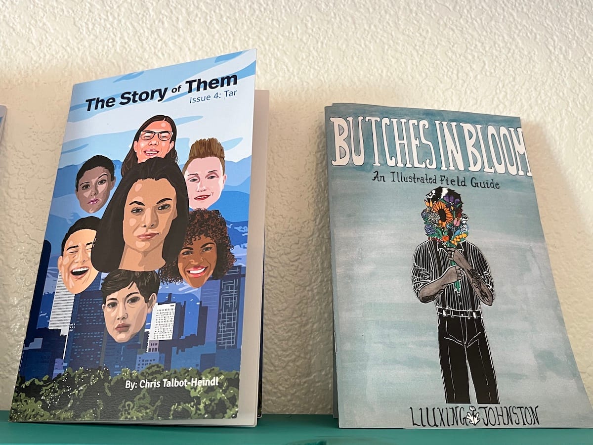 Lucille sells more than 600 titles in the store, and about 200 titles online. The selection changes as some zines sell out and new zines get added into the mix. Recent offerings have included Butches in Bloom: An Illustrated Field Guide by Liuxing Johnston, Trans Restroom Rants by Birch Rosen, Climate Change Anxiety: The Zine! by Sarah Beth Kaye, Artist Insecurities by Sabrina S., and Beautiful Brown, Like Me by Kuwa Jasiri Indomela.