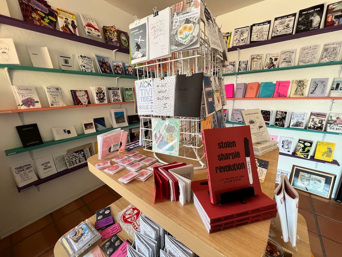 For Lucille, who founded the zine store in 2015 and moved to their current location on the outskirts of the Roosevelt Row arts district in early 2021, news of books being removed from school and community libraries reinforces the role of zines in contemporary society. “Pen and ink have revolutionized movements and culture and information sharing, and that’s especially true for zines because they’re unedited,” Lucille said. “They’re extremely necessary right now.”