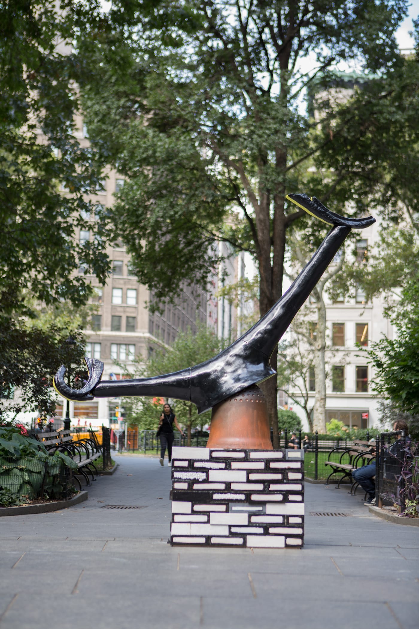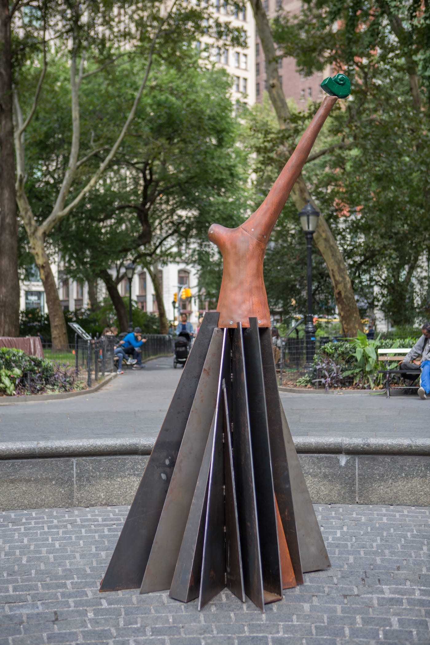 The other sculptures in Shechet’s exhibition are deceptively joyful, yet again, she smuggles political content into the park — this time through the statues that populate the emptied pool basin. Altogether, the resulting picture is reminiscent of Paris’ whimsical Stravinsky Fountain that sits near the Centre Pompidou, spouting water from zany loop-de-loop sculptures and an outsized pair of red-lipsticked lips. Like the reflecting pool in Madison Square Park, the Stravinsky Fountain is a common meeting point for people.