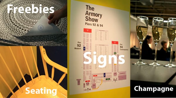 Not for nothing did Armory organizers hire the folks at Bade Stageberg Cox to wrestle with the layout of the notoriously unaccommodating space. Not only did the renowned firm create near-comfy VIP spaces and dot the floors with public lounges, cafés, and seating, but they definitely improved the general layout, making it easier (and way more pleasant) to navigate. A theme of brightly-painted yellow chairs helps to flag areas where there may be seating and amenites.