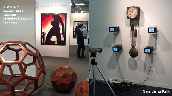 Edward Tyler Nahem Fine Art filled their space with Andres Serrano’s amusing cibachrome prints of toys gone mad. The rude scenarios and livid colors contrast nicely with the elegance of Ai Weiwei’s Wooden Balls at Hyundai across the isle. Hyundai, returning to the Armory after a long hiatus, provided a zen vibe with a meditative clock installation by Nam June Paik.