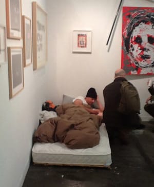 Teapot gallery hosted Christian Eiesnberger, who, laid up in bed with a cold, was not about to skip attending his solo show in their Armory booth. So he had the gallery set up a bed in a corner where he could convalesce while conversing with shoppers! Surrounded by his signs made of finger painted horse poo, he made Teapot look like a Bowery rental. SHAME ON YOU EISENBERGER. ;)
