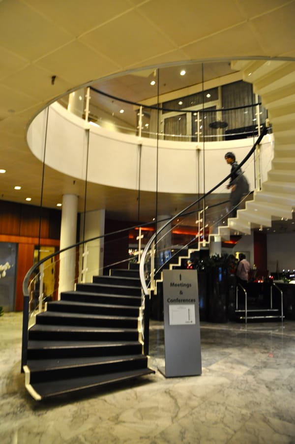 If the chairs continue to look sleek, modern and beautifully conceived, time has been less kind to the hotel itself, which has the misfortune of appearing more like a time capsule than a window to the future. I almost expected to find people smoking at the table or desks. The marble floors and wood paneling feel thoroughly dated and the low ceilings, which appear to be acoustic tiling, don’t measure up to our contemporary associations with design luxury.