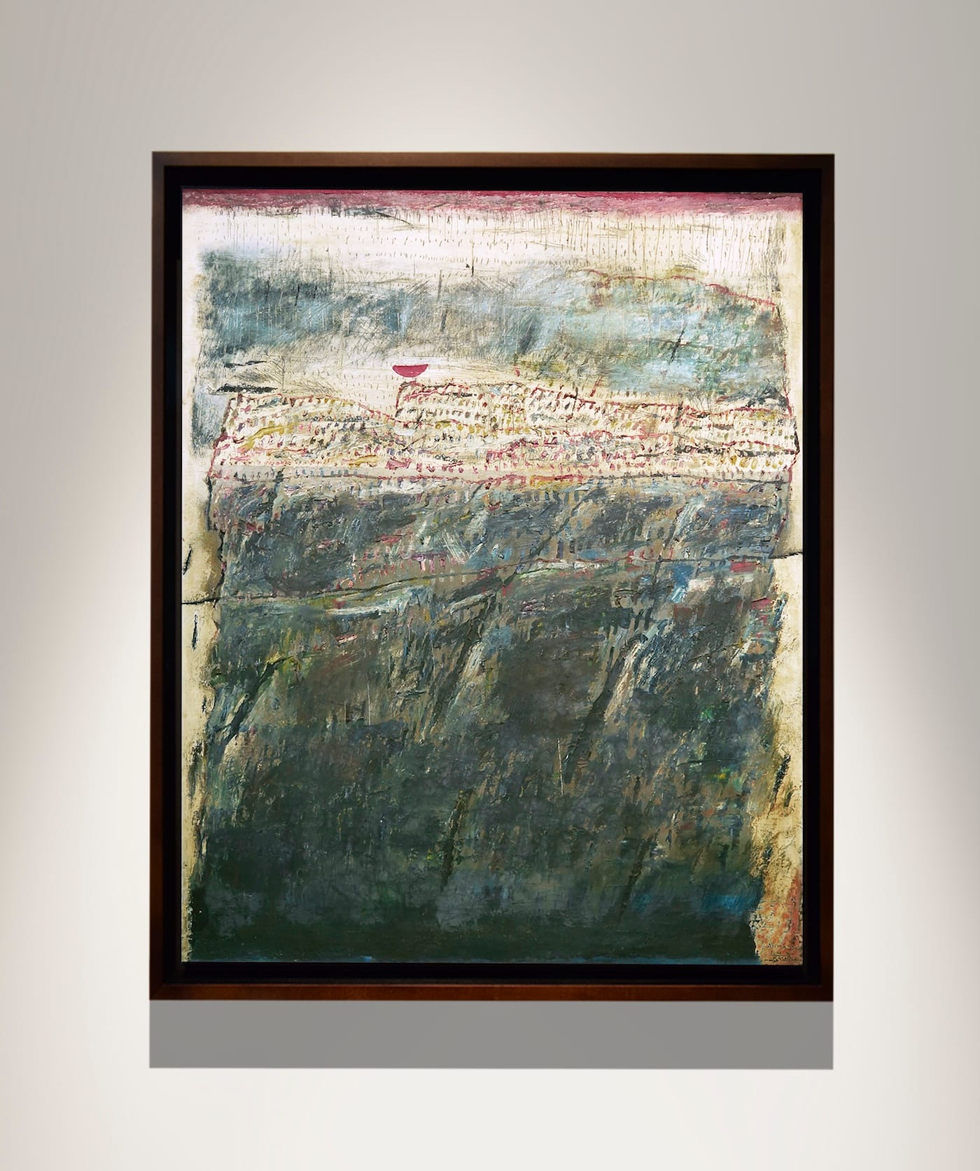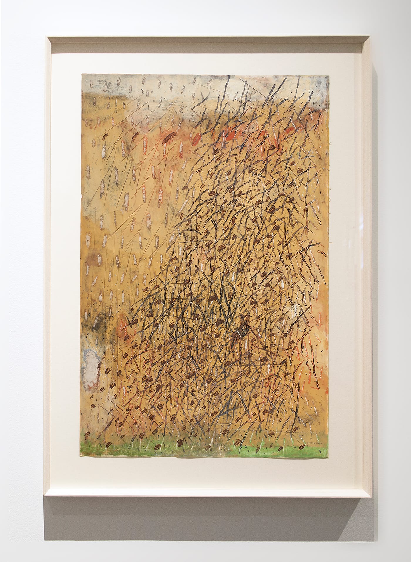 For Singh, the aim was never pure abstraction. Landscape is clearly on her mind when she begins dividing the works into three distinct areas, each defined by the kinds of marks she makes and the materials she uses. But even as she approaches landscape, the marks remain abstract rather than descriptive. In “Sunset at Kasauli,” the materiality of the paint is central. We see clots and daubs, smeared surfaces, and gouged lines. With its thin band of red sky along the painting’s top edge, and its profusion of short and long scratched vertical lines just below it, I felt as if I were looking at a state of quiet turbulence.