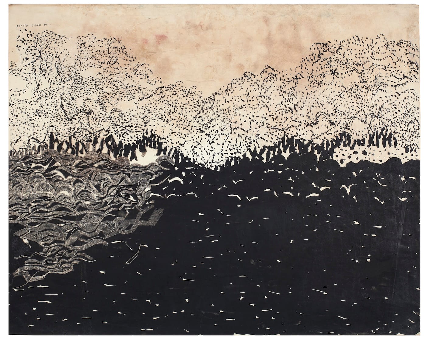 “Untitled” (1980), an ink on paper hanging just to the right of “Sunset at Kasauli” in the current exhibition, shows Singh’s mastery of her simple means. Compositionally, the work is divided into four areas evoking a field, trees, foliage, and sky. The sky is defined by a triangular space extending down from the top of the paper, which the artist has left unmarked. The largest section starts at the bottom edge and takes up more than half the paper: it is made of ink brushstrokes that become a dense black field accented by scattered short horizontal lines and shapes defined by unmarked areas of the paper. On the left side of this black field, Singh has made a cluster of wave-like marks by wiping away the ink before it dried. That decisiveness adds to our experience of this remarkable work.