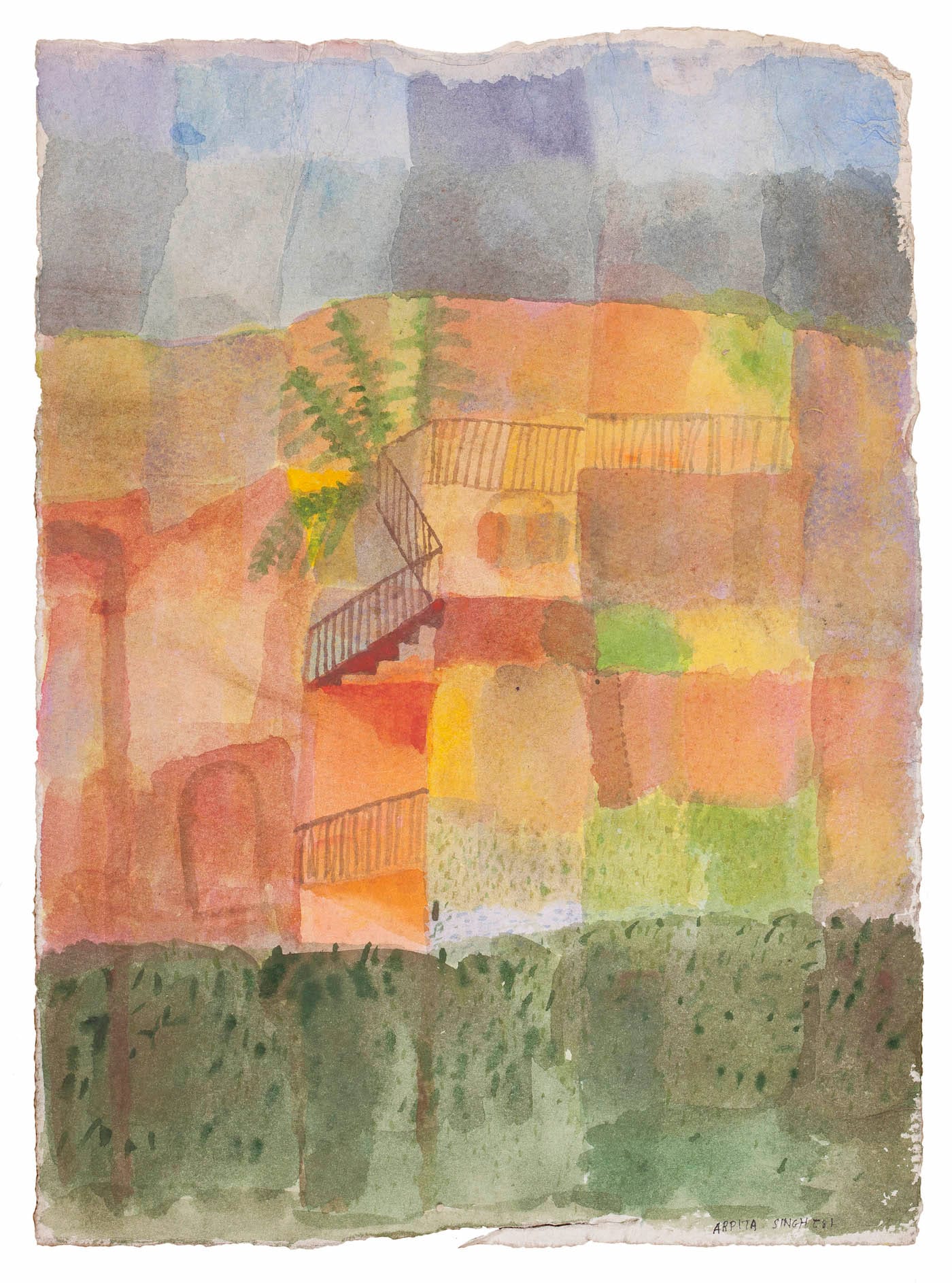 According to the art historian Deepak Ananth, who has written a major monograph on Singh, the artist was inspired by the Paul Klee quote from his Pedagogical Sketchbook (1960): “An active line on a walk, moving freely, without goal. A walk for a walk’s sake.” In an untitled watercolor dated 1981, Singh’s patchwork of muted colors to depict shrubbery, a building with railings, and the sky shares something with Klee’s faceted depictions of cityscapes. By this time, having largely limited herself lines and dots for a decade, she is ready to move on.