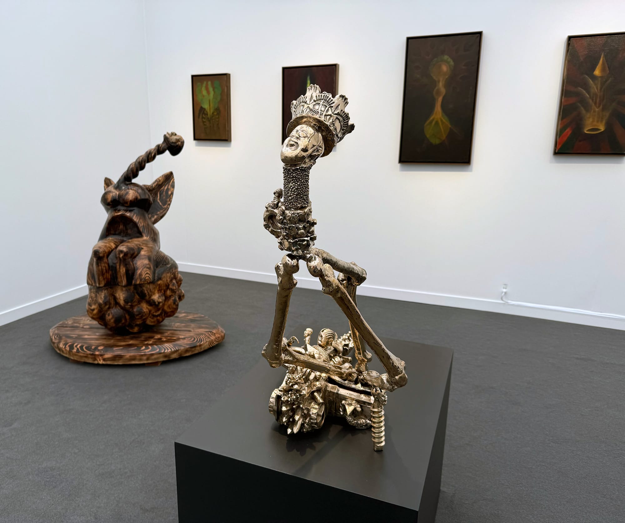 LA art dealer Sebastian Gladstone said he had sold seven of nine wood and bronze sculptures by Emmanuel Louisnord Desir, each priced between $10,000 and $40,000. In a shared booth with Stars gallery, one of the strongest presentations at the fair, Desir’s sculptures mixing Afro-futurism with a dark, gothic aesthetic were paired with visionary paintings by the late Mette Madsen.