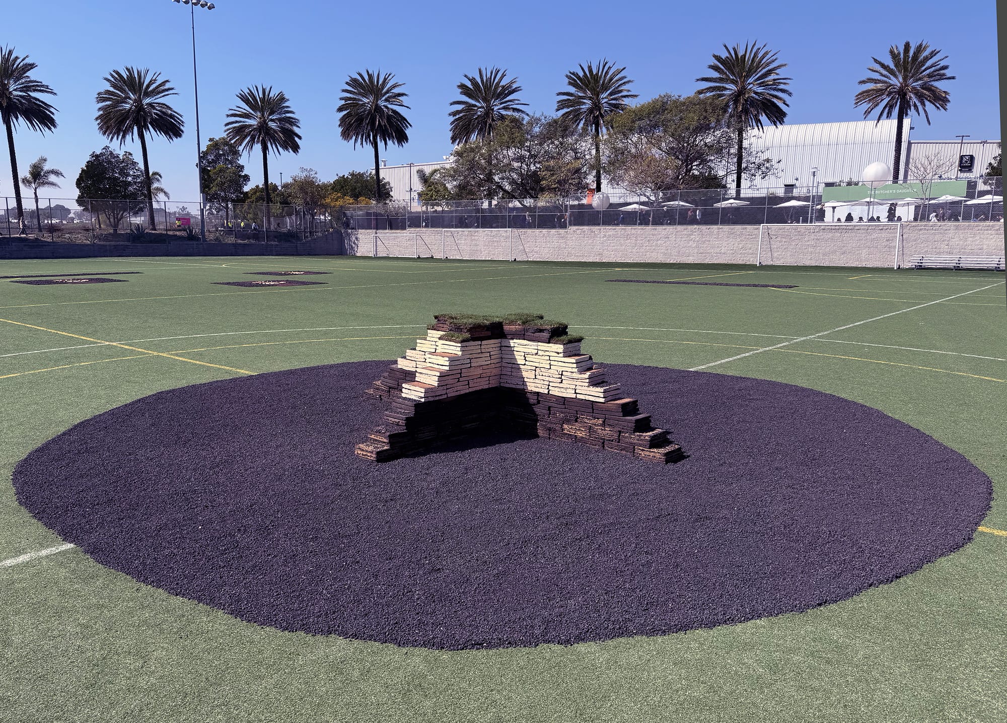 Countering the rapid rise of xenophobia, intolerance, and nationalism, expressions of solidarity and resistance could be seen elsewhere throughout the fair, notably in several Frieze Projects, including Jackie Amezquita’s “trazos de energía entre trayectorias fugaces (strokes of energy between impermanent traces)” (2025). The artist’s installation of lava rocks, soil, and corn masa that took up much of the soccer field, the focal point of which was a Mesoamerican pyramid. Nearby, Ozzie Juarez had recreated a South Central Swap Meet, inspired by those he grew up going to, and was giving away toys sourced from these actual gatherings and repackaged.