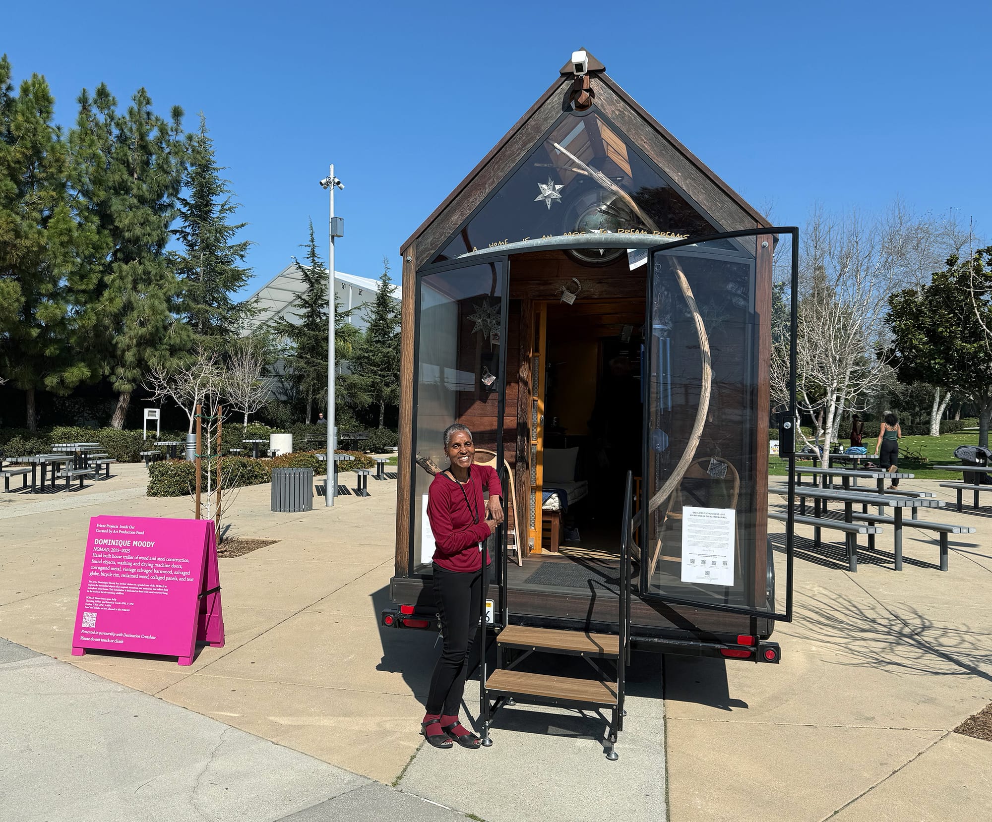 Still, the specter of the fires was impossible to ignore. It was immediately evident as I walked up to the tent, where I encountered Dominique Moody’s “NOMAD” (2015–2025), a hand-built trailer made from wood, steel, and scavenged parts, one of eight public artworks comprising the Frieze Projects x Art Production Fund initiative. Moody built the trailer at Zorthian Ranch, most of which burned down in the Eaton Fire, and had been visiting with the family of the late assemblage artist John Outterbridge the day before their homes were destroyed. After the Altadena blaze, she decided to dedicate the work to those “who lost everything” emphasizing the “impact on the larger arts community, in particular the Black Arts community that is so powerfully present there.”