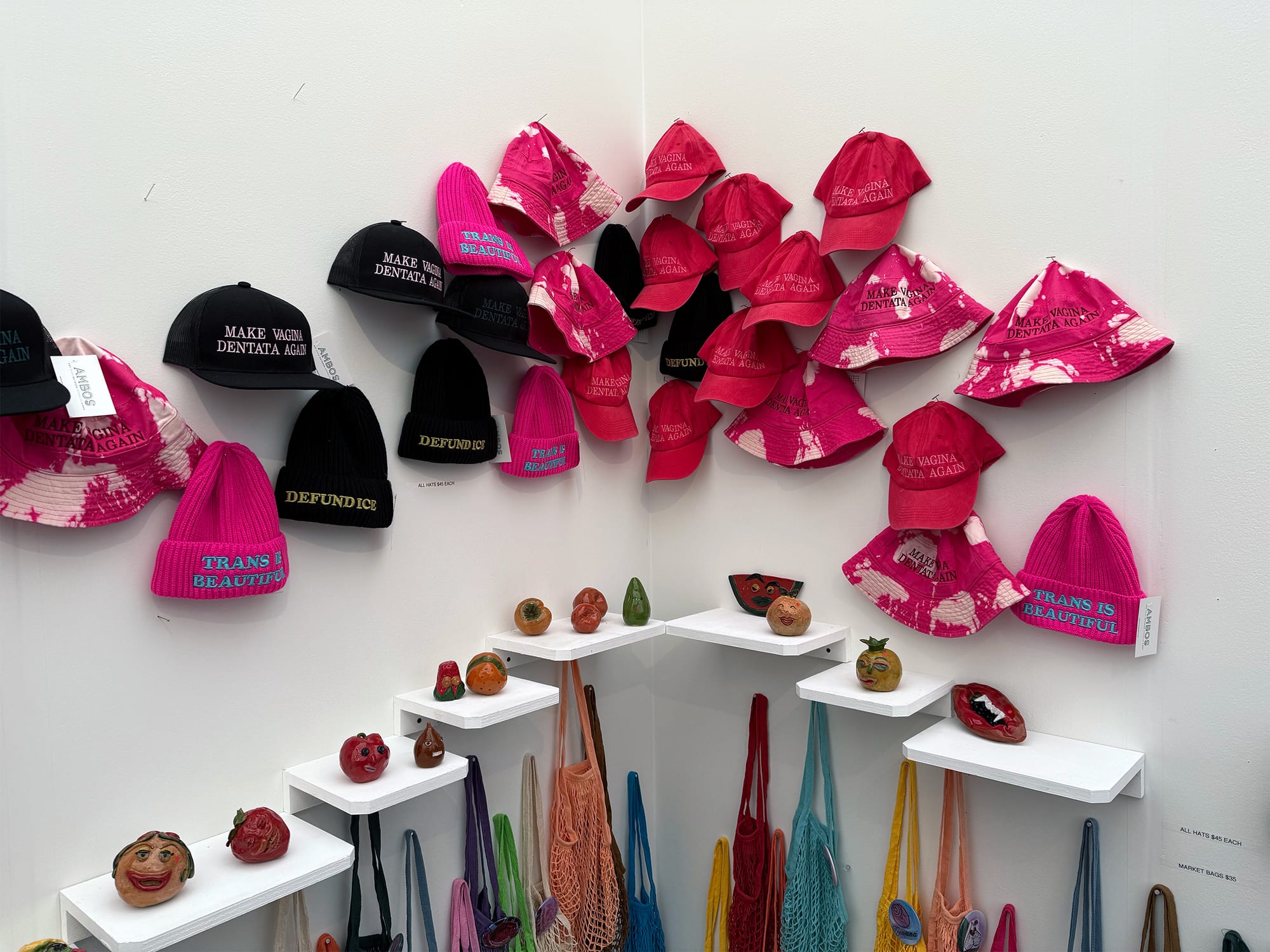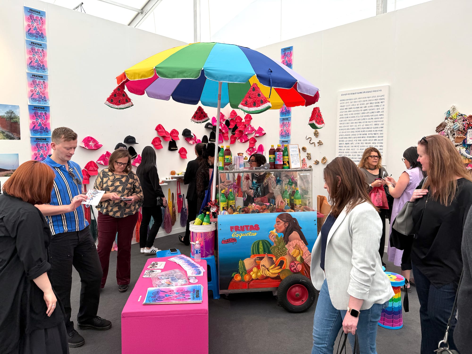 As part of her AMBOS (Art Made Between Opposite Sides) project, Tanya Aguiñiga designed a fruit cart where she and her sister Karla Aguiñiga are showing a ceramic installation of erotic fruit sculptures, Frutas Coquetas (Sexy Fruit) (2025), created by artists in a program for refugees and asylum seekers. Despite their prominent location inside the tent for the first time, and the crowds surrounding the cart, Aguiñiga noted the disconnect between the fair’s typical audience and her community-based art practice.