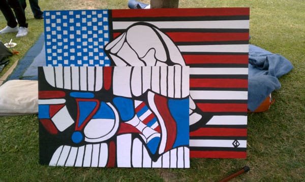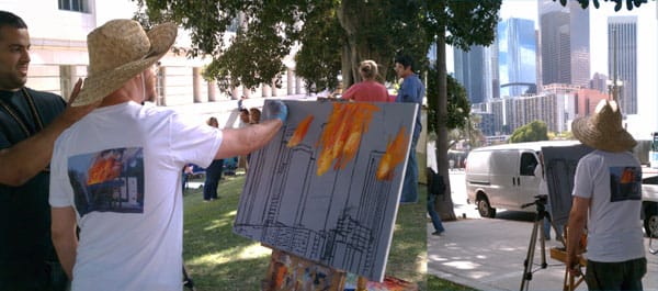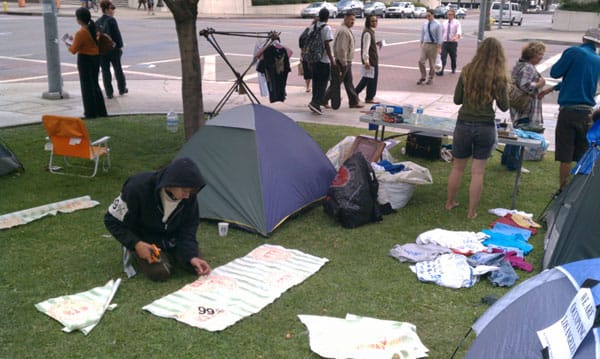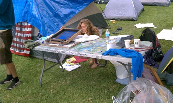 LOS ANGELES — Four days into #OccupyLA, a small community is growing near the steps of Los Angeles City Hall, where protesters have set up camp. The site contains first aid and media tents as well as stages for performers and speakers. In the afternoon, some protesters screen printed clothing while others worked on paintings for a public gallery. The scene in Los Angeles is a flurry of activity with artists working together to build a more visible movement.