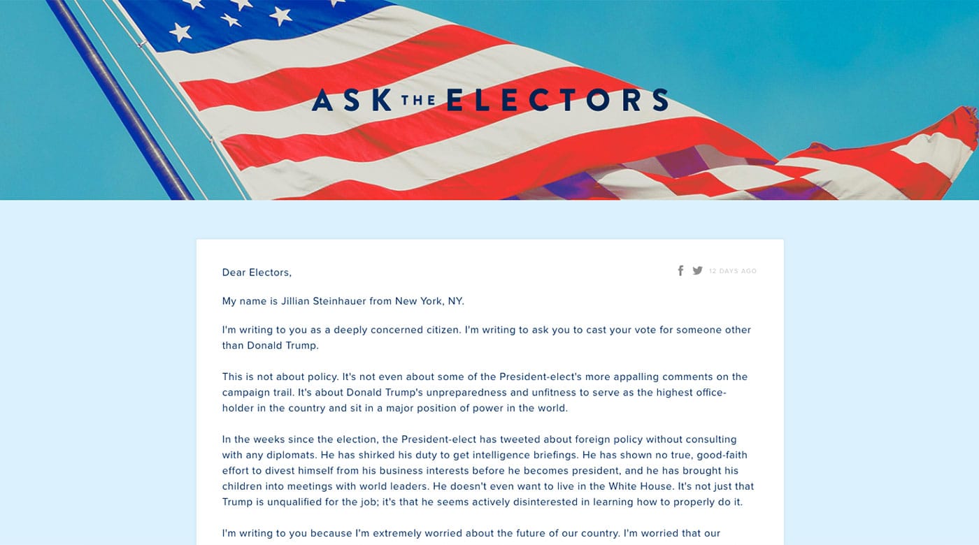 That was the first non-automated response I received from the Republican Elector. Our conversation began with that online tool that lets you write to all of the electors in one go. I drafted a heartfelt letter imploring them to use their consciences and vote for anyone other than Donald Trump. I felt exhilarated at the prospect that little me might get through to powerful them. Then I got the Elector’s auto reply.