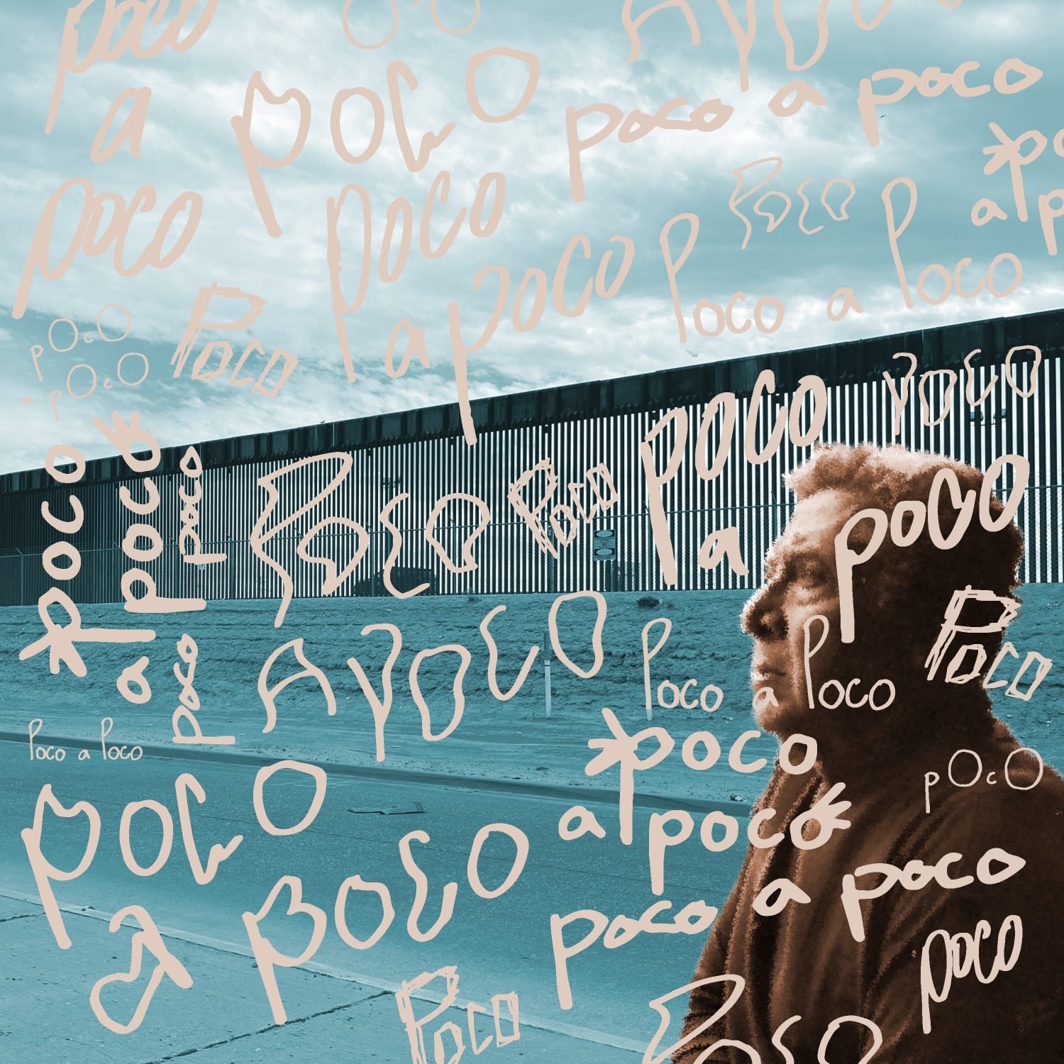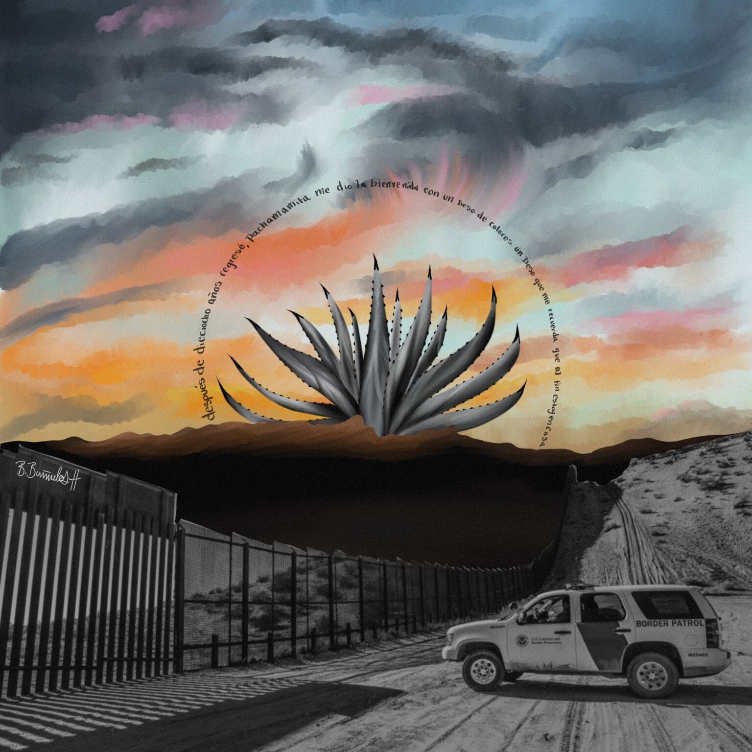 United by overarching themes and digital format, the photographic works featured in BorderPlex display a range of styles, subjects, and techniques. Portraiture contributed by Sofie Hecht and Louisa Mackenzie; Jimmy Himes-Ryann; Jessamyn Lovell; and Alicia Robinson-Welsh ranges from relatively candid to highly stylized. Renteria experimented with neon lighting and long exposure, carving a luminous border beneath Santa Elena Canyon’s notoriously dark sky. Hierro-Villa and Rivera’s included work melds a naturalistic, emotive lens with journalistic realism, capturing resistance on both sides of the border. Billie Class’s self-portraiture tempers critical reflexivity with humor and Pop Art aesthetics. Bañuelos-Hernandez’s mixed-media work contrasts the bleakness of border physicality with the native beauty of the maguey. Likewise, Ruben Loza’s piece overwrites the border, transforming it "poco a poco" — little by little.