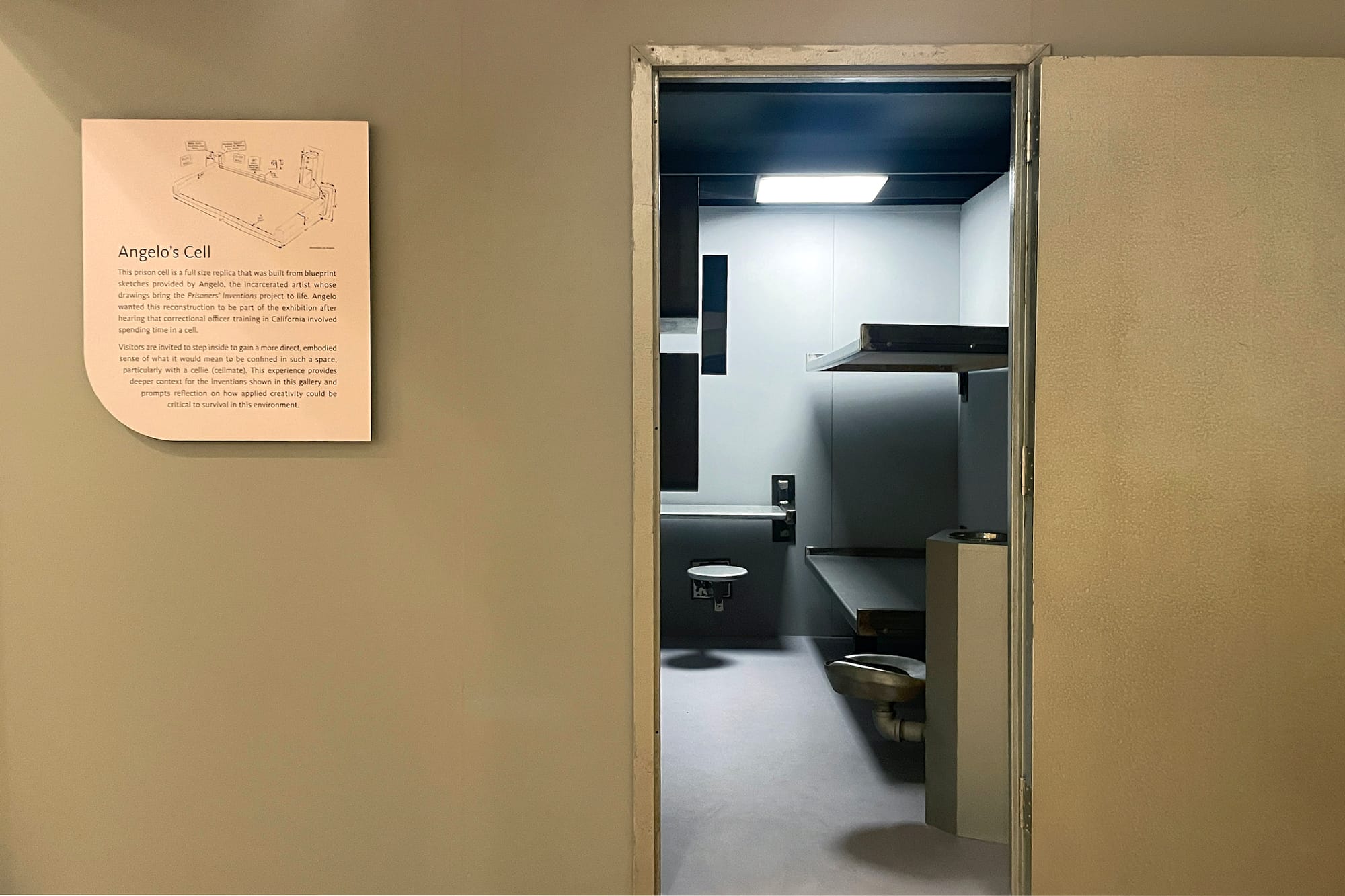 LOS ANGELES — As I walked through No Prior Art: Illustrations of Invention at the Los Angeles Public Library’s downtown Central Library, a small installation stopped me dead in my tracks. Through an open door was a jail cell, sparkling in its brand new stainless steel. Squeezed into the narrow room, about the size of my walk-in closet, was a bunk bed, desk, shelving, and toilet mounted mere centimeters away from the bottom bunk.
