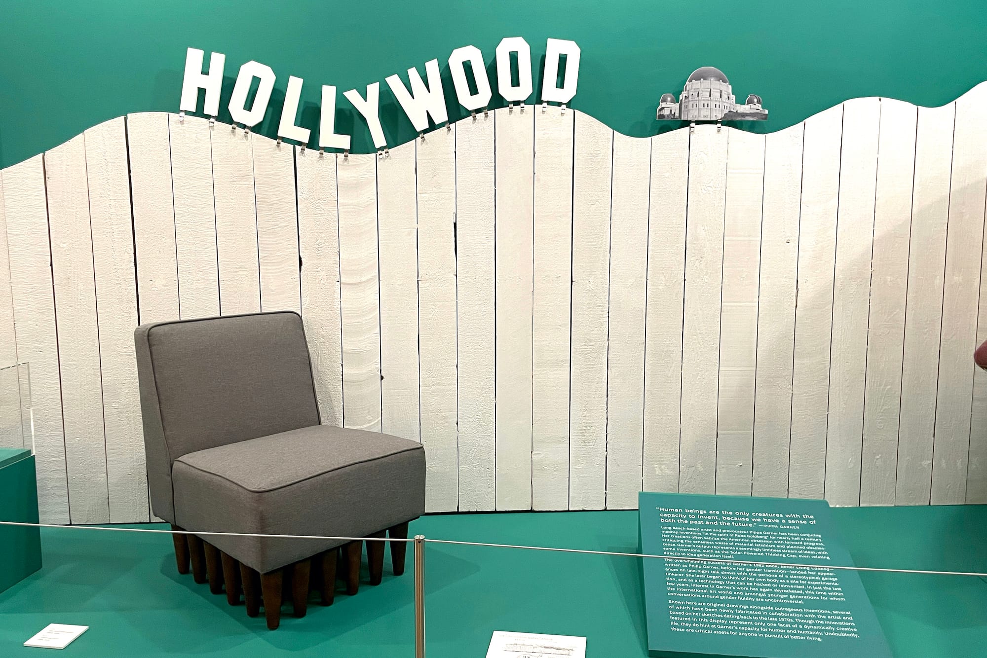 New commissions include an eclectic array of objects by Pippa Garner, who has been sketching quirky, gender-bending items since the 1970s. The library turned a few of her drawings into physical prototypes. They include the “Shu-Haul (shoe trailer)” (1980s–2024). A play on a stereotype of lesbian culture, U-Hauling, is made literal with a miniature truck bed hitched to a brown loafer. Angelenos may also want to get their hands on “The ‘Hollywood Effect’ Fence” (1983–2024), which lets anyone clip miniature versions of the iconic Hollywood sign to their white picket fence.