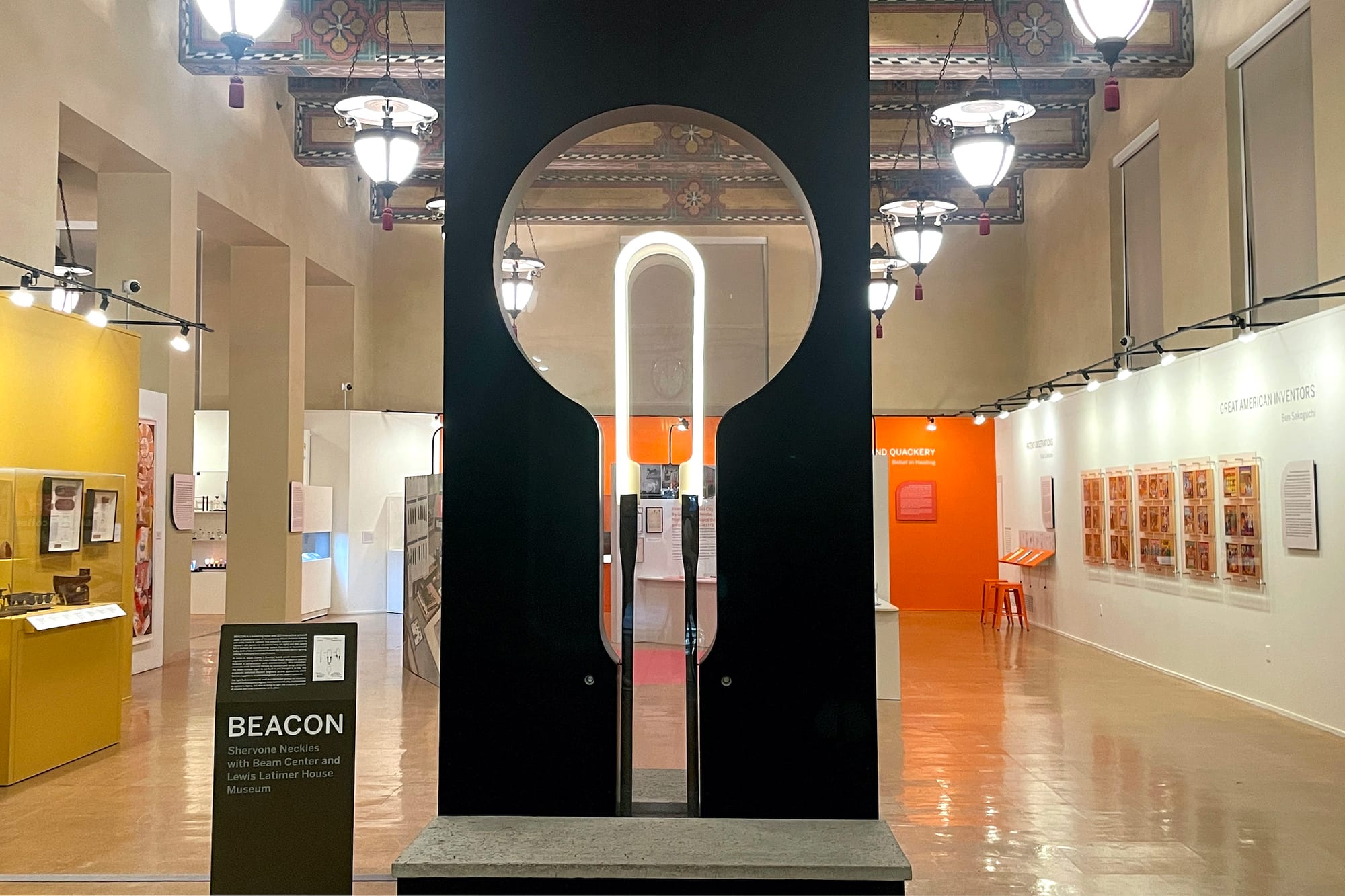 The exhibition juxtaposes these historical objects with contemporary artworks and commissions inspired by patents. For instance, Shervone Neckles’s large, black metal lightbulb sculpture, “BEACON” (2020–21), automatically glows when visitors approach it. Neckles based the work on an illustration for a carbon filament Lewis H. Latimer, an inventor, engineer, and freed slave, developed in 1881. And KAOS Network, artist Ben Caldwell's media lab, shows off its prototype for an Afrofuturist, driverless car, upholstered in Kente cloth, which Caldwell hopes will cruise through Sankofa City, a community-designed, radically Black urban enclave that he has been building in the Leimert Park neighborhood of LA.