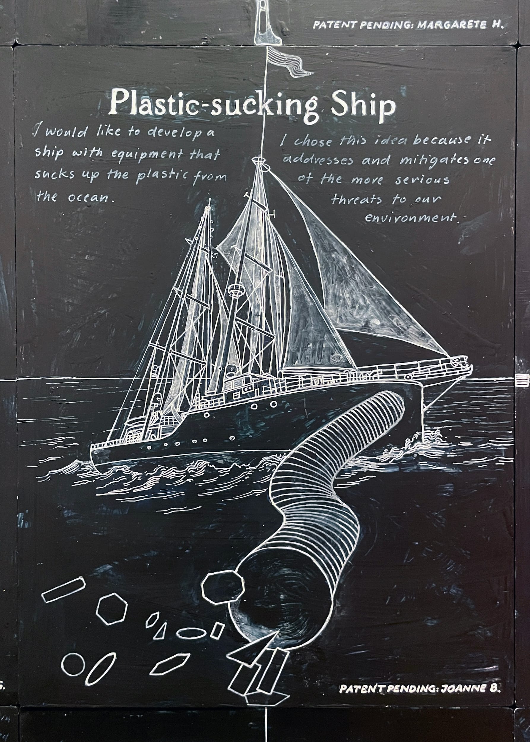 No Prior Art also allows audiences to become inventors through a series of collaborations with painter Ellen Harvey called The Utopia Machine (2024). Write an invention on a slip of paper and throughout the show’s run Harvey will render it in monochrome acrylic paint on black wood. So far, people have dreamed up an ant-proof cat food bowl, which the artist adorns with hoses to siphon the intruders, and a plastic-sucking ship, where a powerful hose vacuums all the trash out of the ocean.