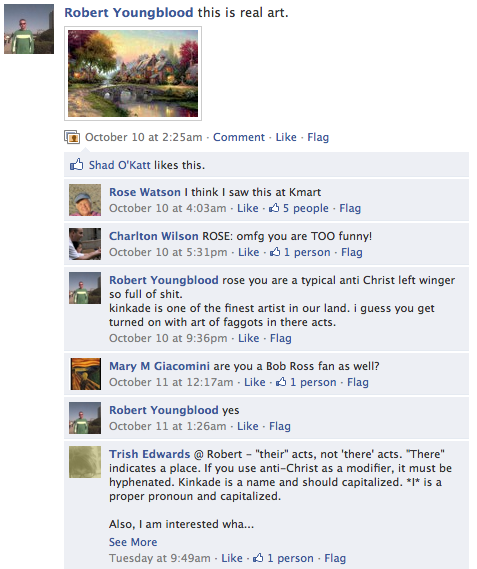 The attack has also turned the Loveland Museum/Gallery’s Facebook page into a bit of a battleground. Some Loveland Museum critics are resorting to intensely racist and homophobic language in their criticism of the Museum’s decision to show the work. One commenter has posted a YouTube video on the page, which is captioned on YouTube with the following: