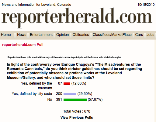 Last week, Adam Lerner, the executive director of the Denver Museum of Contemporary Art, paid a visit to the Loveland Museum and spoke with the institution’s curator. He told the Denver Post that the same exhibition had been on display for five months at Lerner’s museum, with 25,000 visitors seeing the show, and there were no complaints.