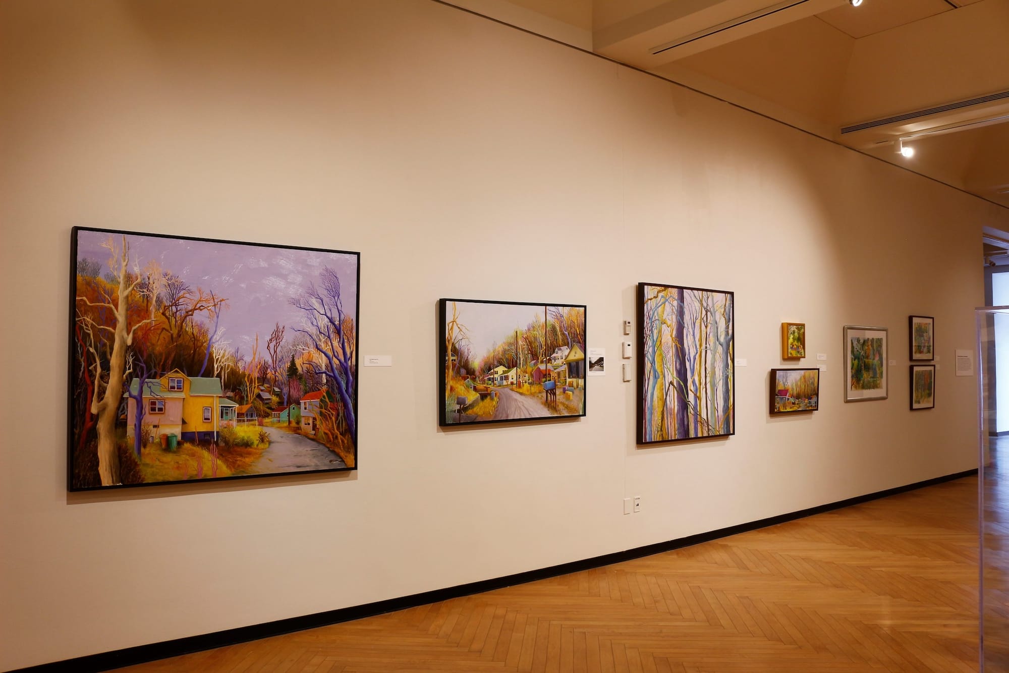 Several of Ellie Schaul’s holler paintings on display at Clay Center’s Juliet Art Museum in spring 2022 (photo courtesy Andrew Gornik, Juliet Art Museum, Clay Center for the Arts and Sciences of WV)